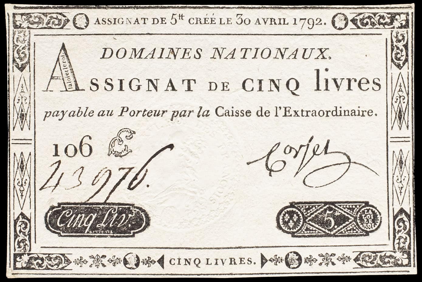 Série 106 E - numéro 43976. Signature : Corsel. Cet exemplaire provient de la Live-Auction CGB de février 2015. Provenance : collection Alain Charollais.