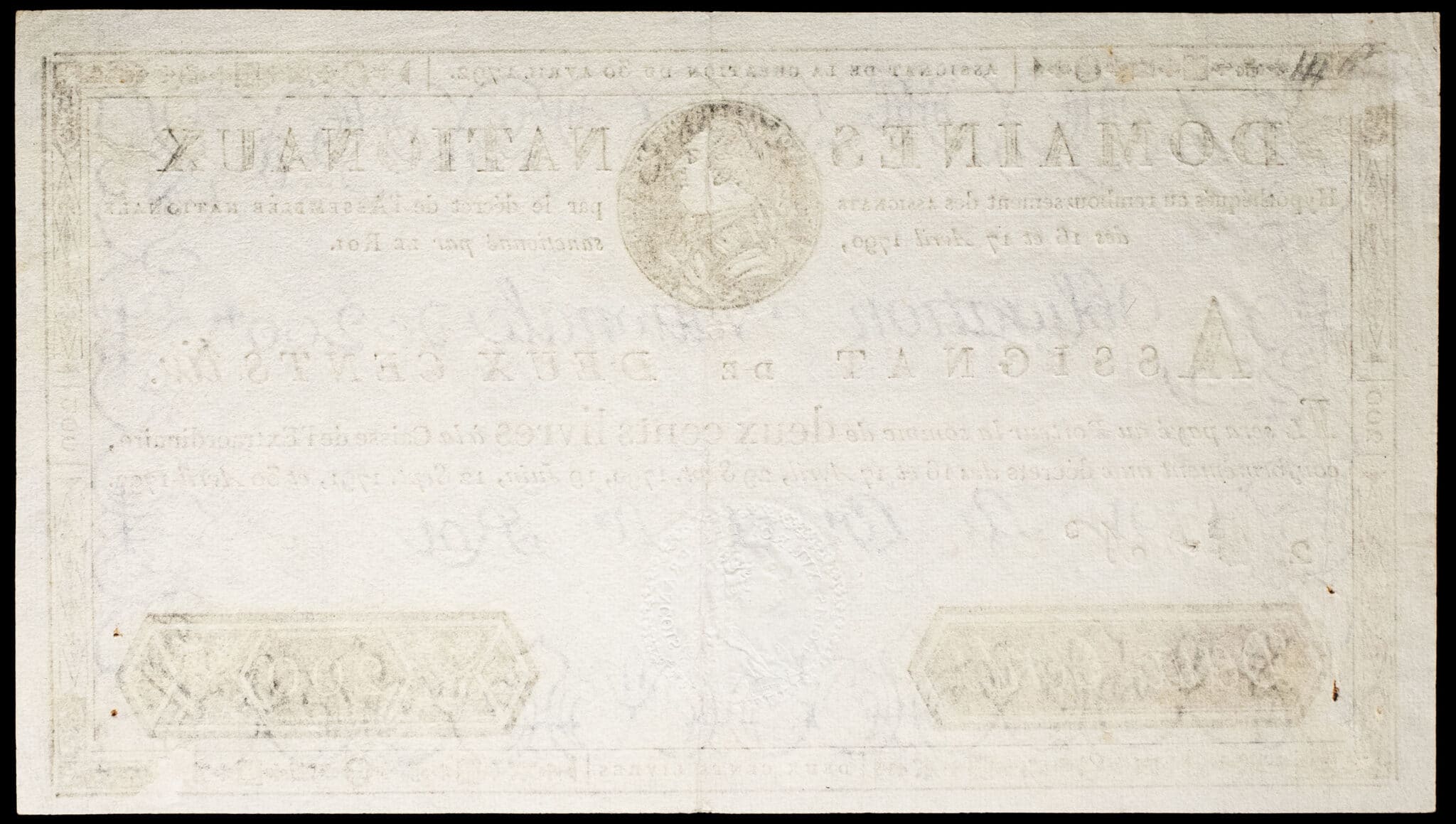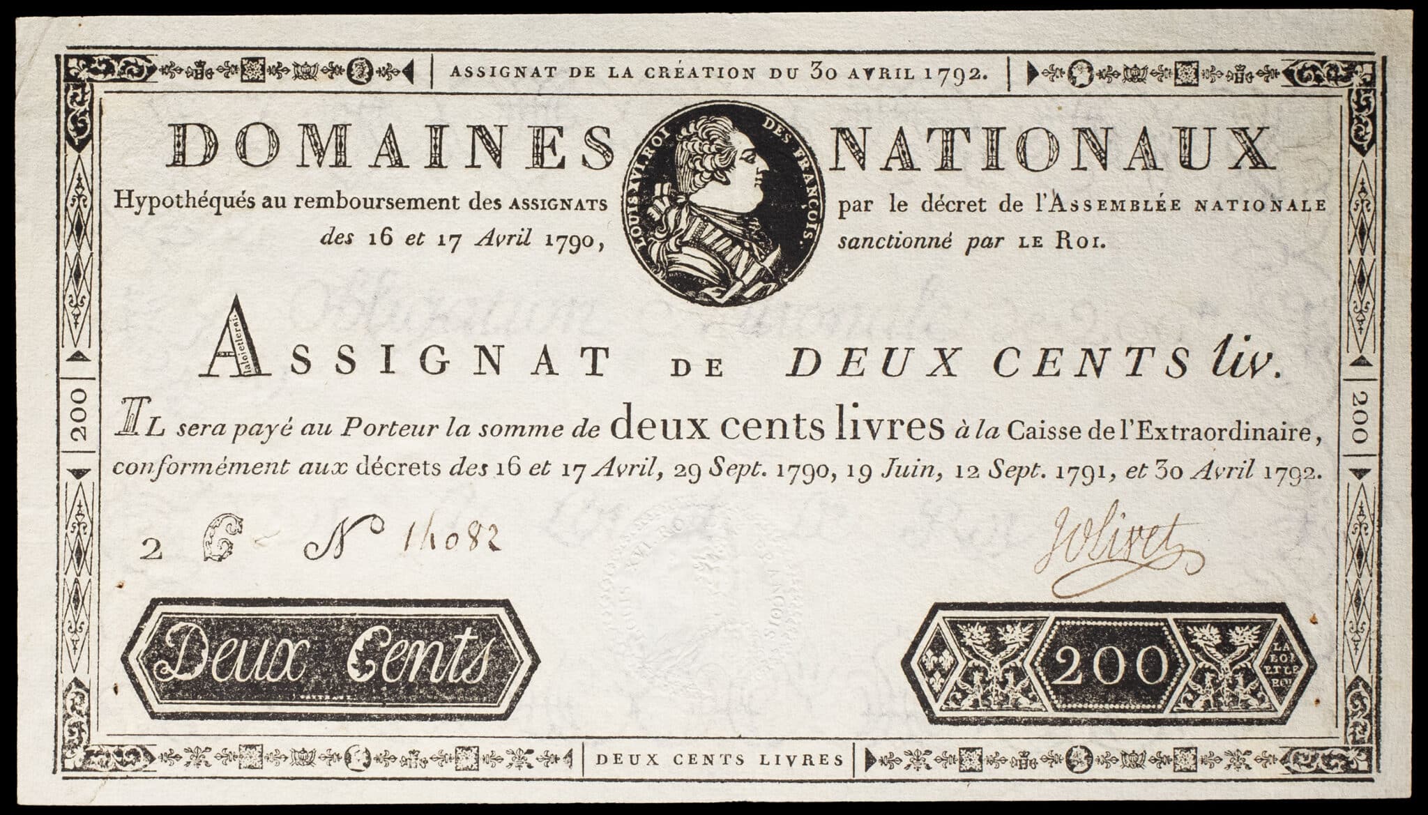 Série 2 C - numéro 14082. Filigrane “1791”. Signature : Jolivet. Provenance : collection Alain Charollais.