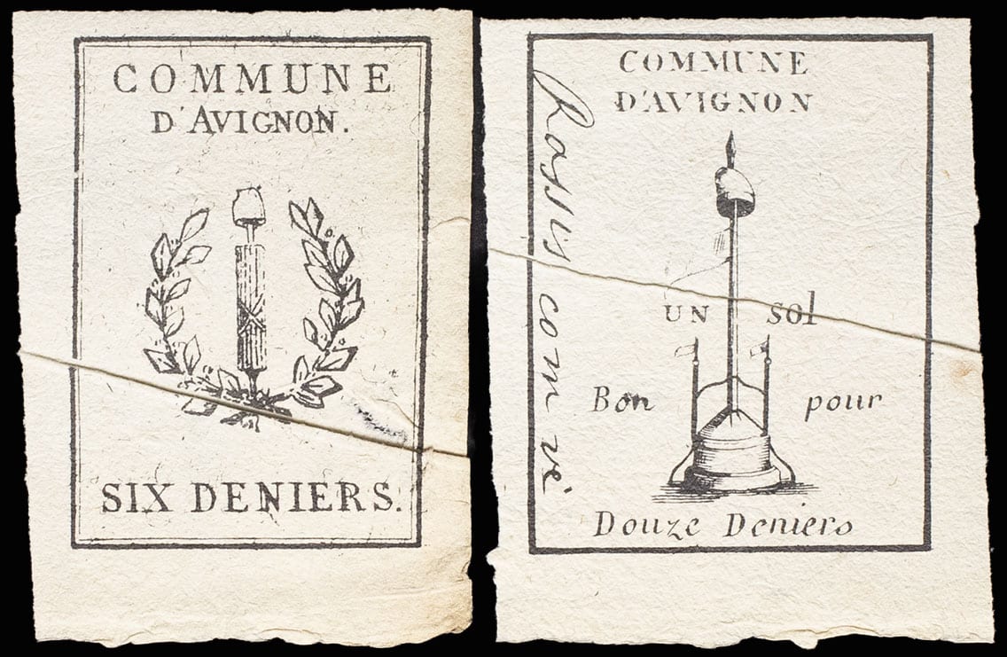 - Lot (2) - Billets de confiance de 6 et 12 deniers d’Avignon ND (13 août 1792).