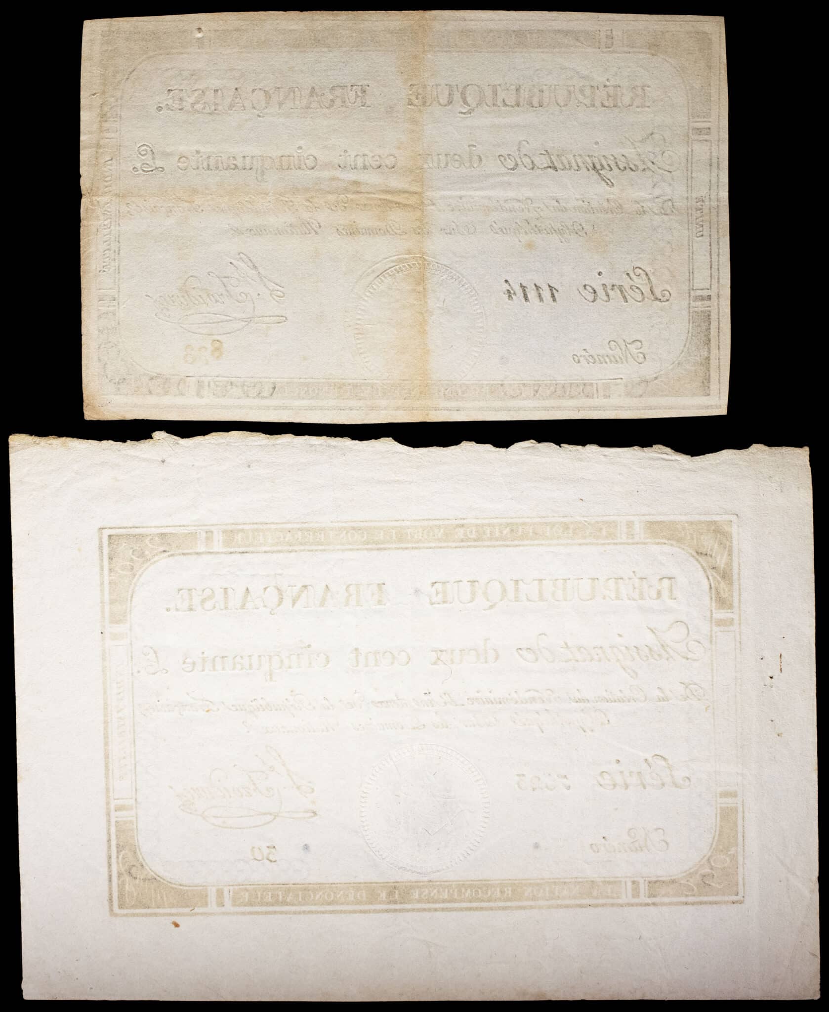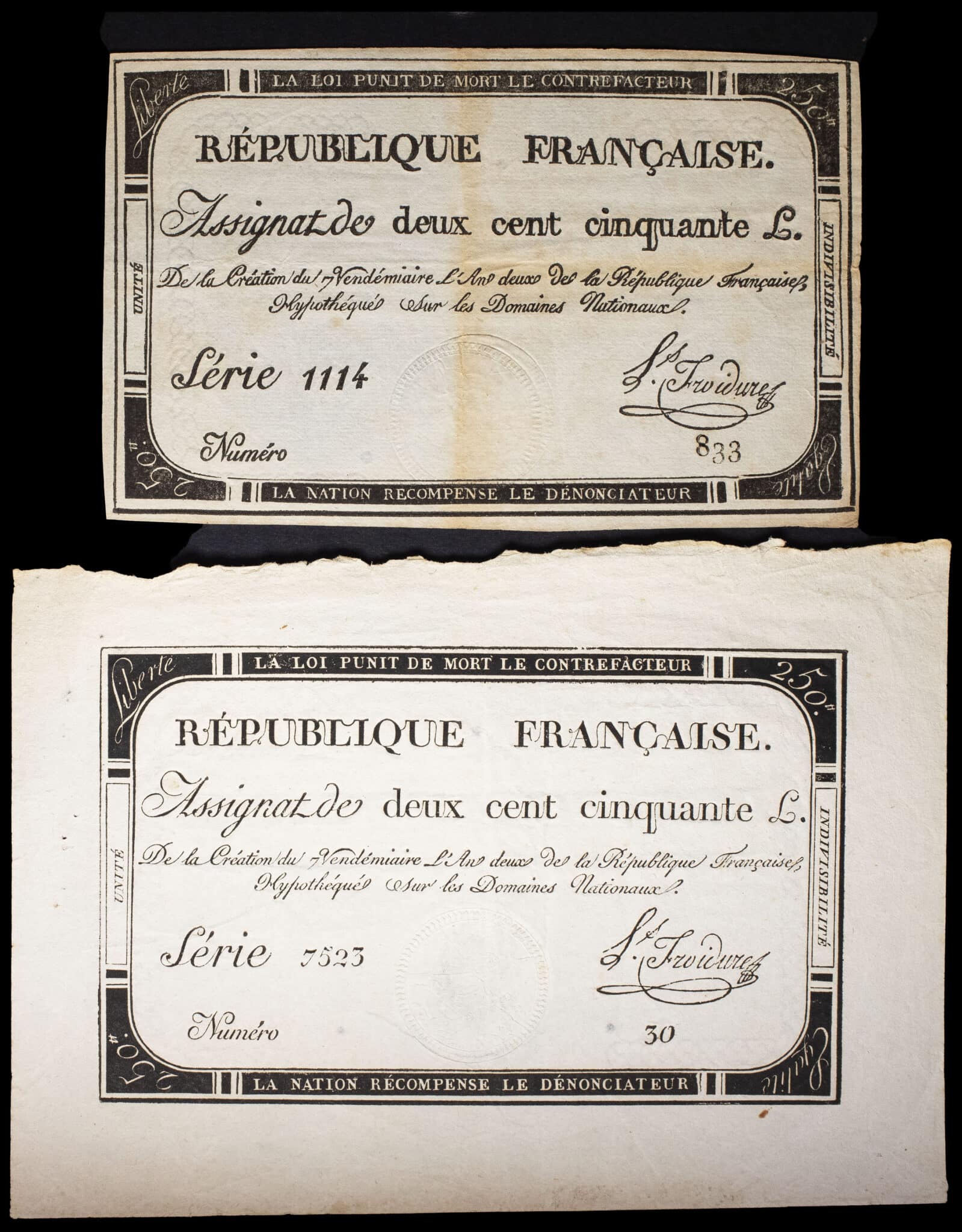- Lot (2) - Assignat de 250 livres (dont un faux d’époque dit “de Quiberon”) - Domaines nationaux 7 Vendémiaire an 2.