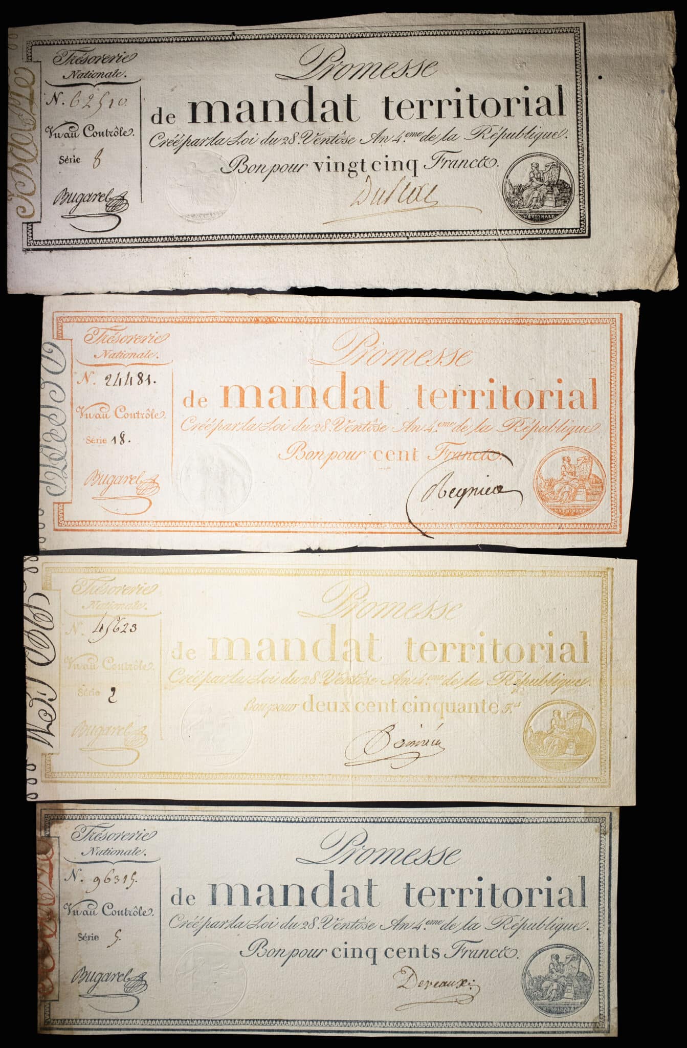 - Lot (4) - Promesse de mandat territorial de 25, 100, 250 et 500 francs (avec série) 28 Ventôse an 4.