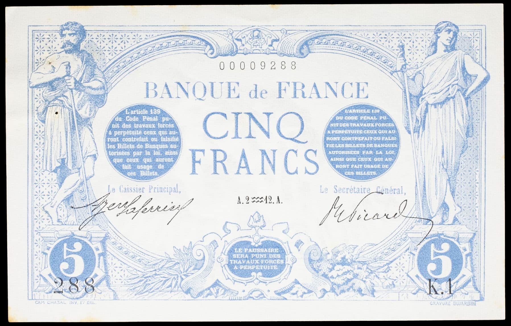 - 5 francs type “bleu” 2 janvier 1912.
