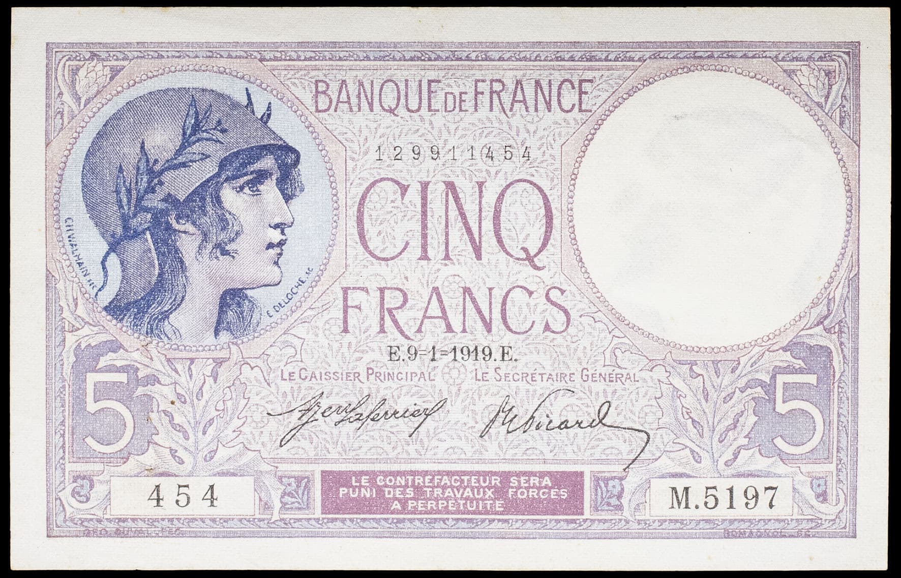 - 5 francs type “femme casquée” dit “violet” 9-1-1919.