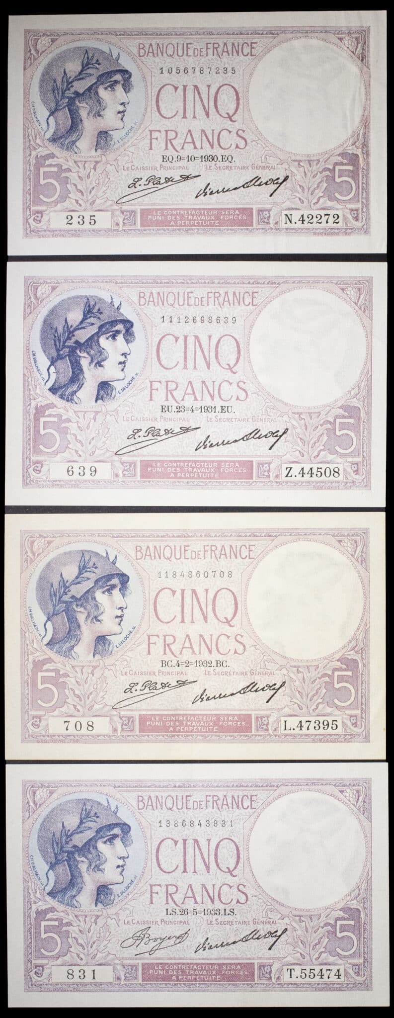 - Lot (4) - 5 francs type “femme casquée” dit “violet” 9-10-1930 au 26-5-1933.