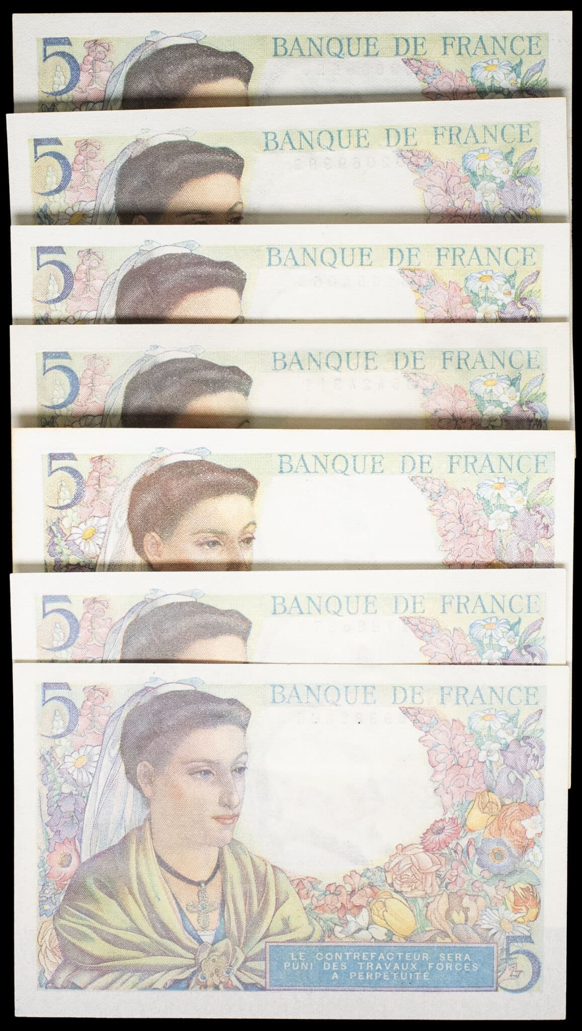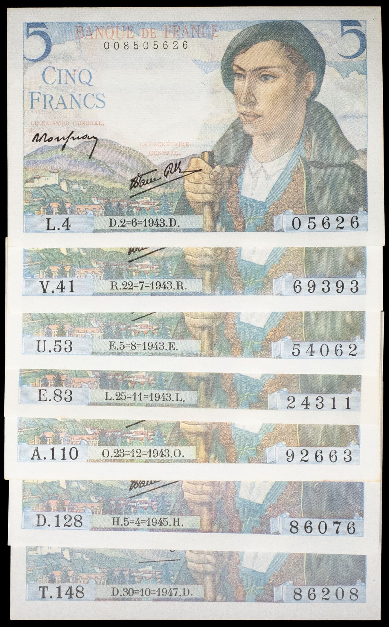 - Lot (7) - 5 francs type “berger” 2-6-1943 au 30-10-1947.