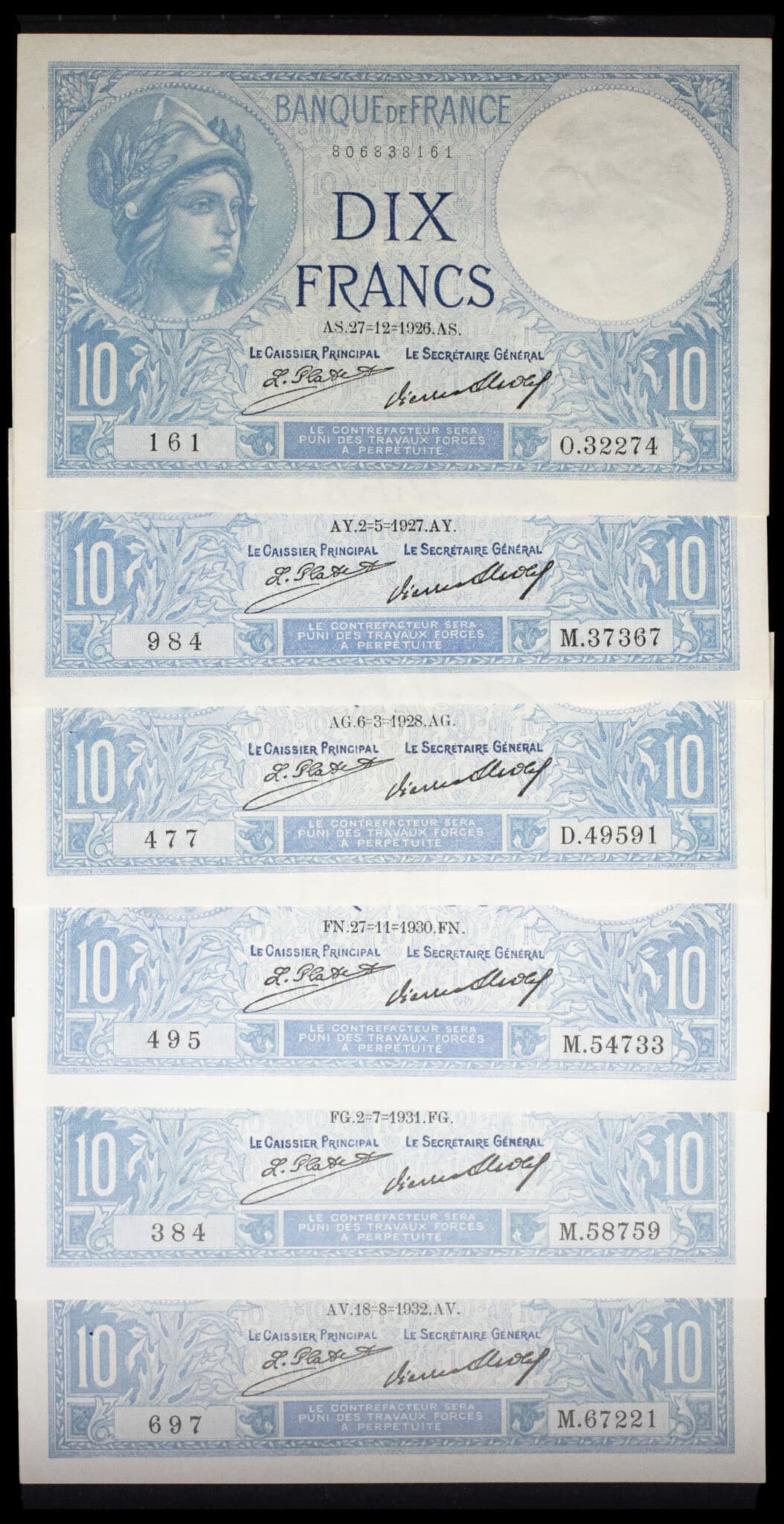 - Lot (6) - 10 francs type “Minerve” 27-12-1926 au 18-8-1932.