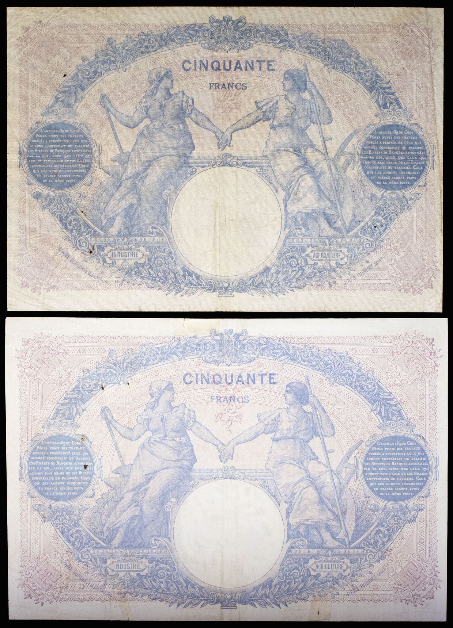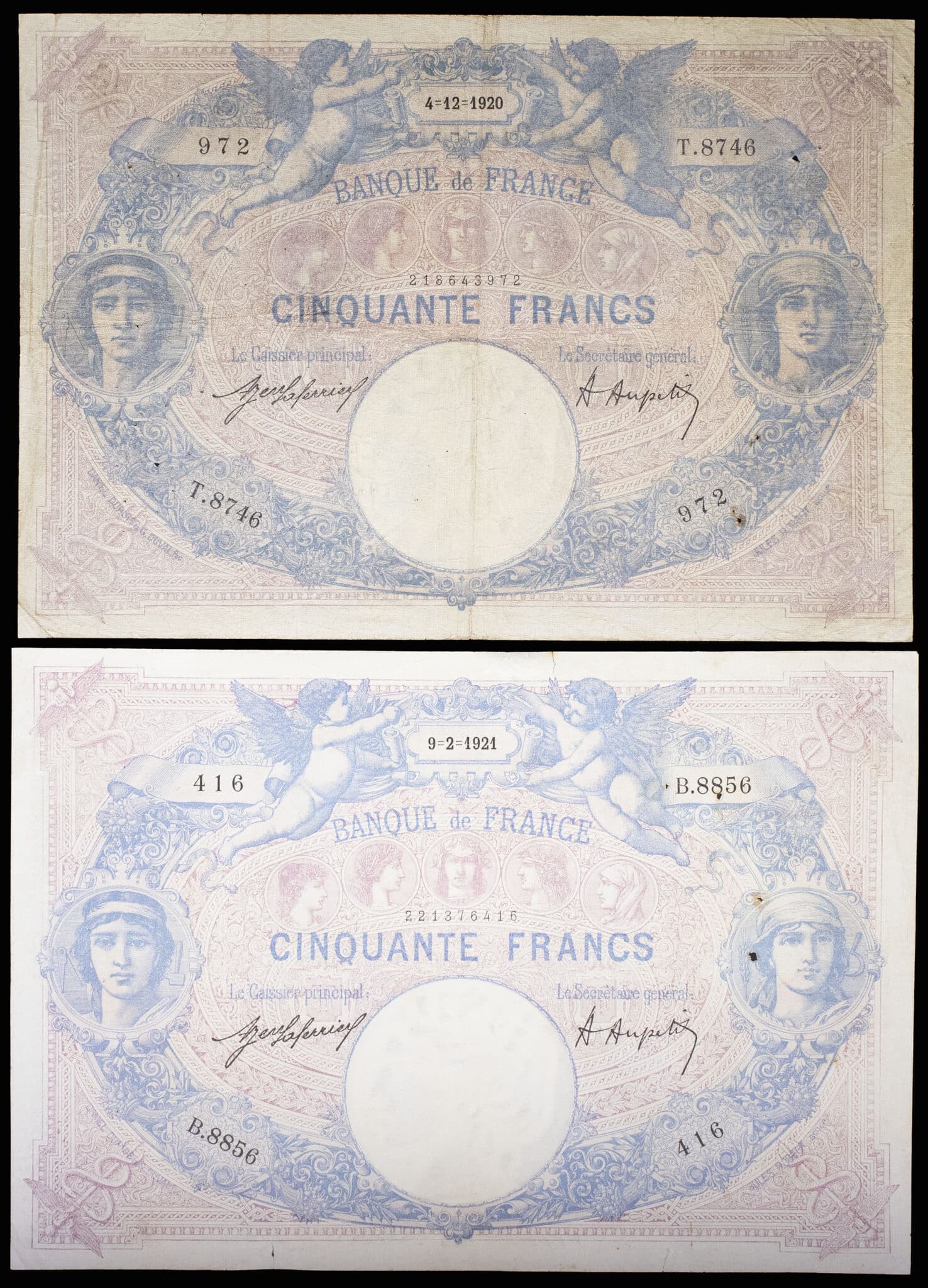 - Lot (2) - 50 francs type “bleu et rose” 4-12-1920 et 9-2-1921.
