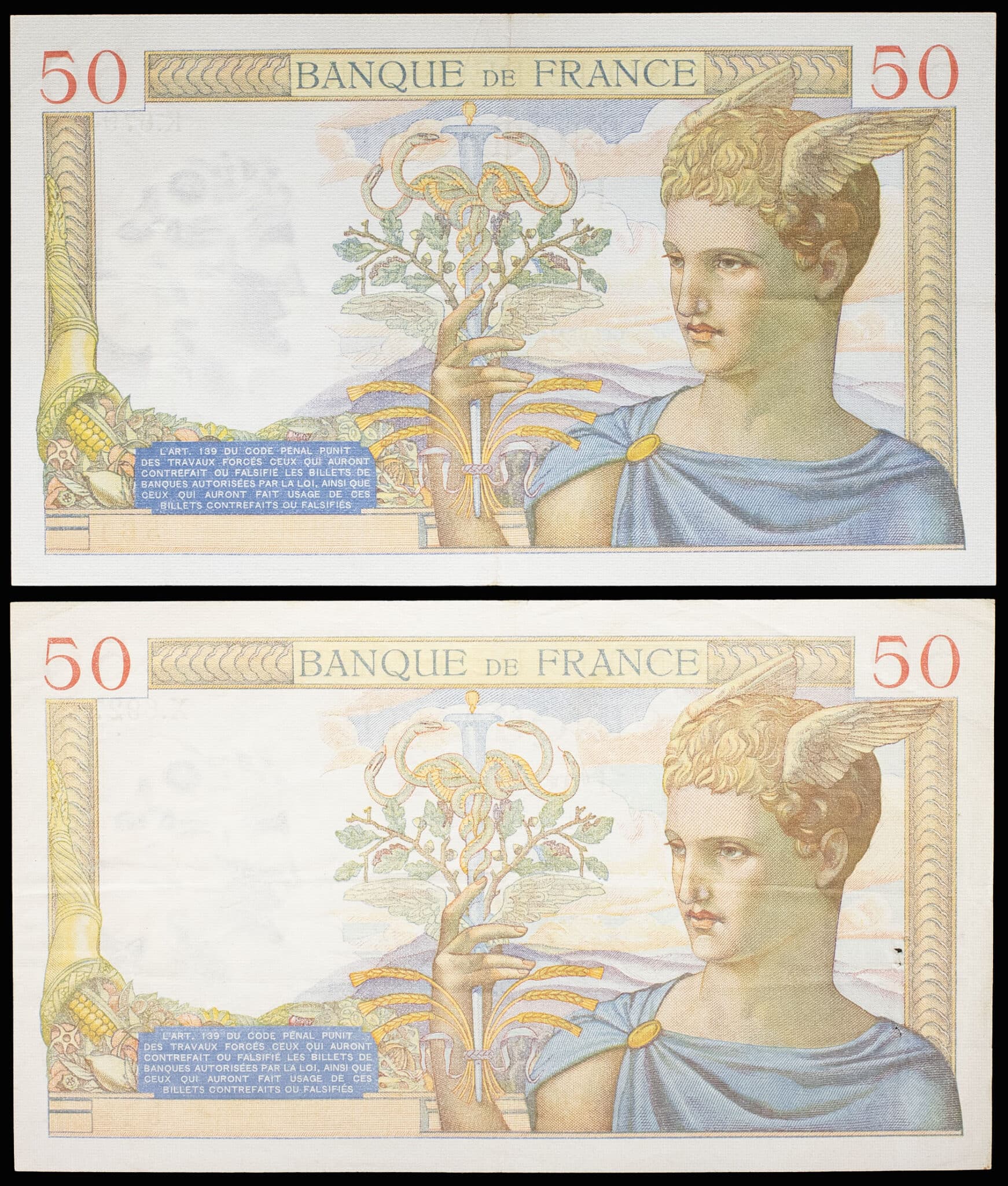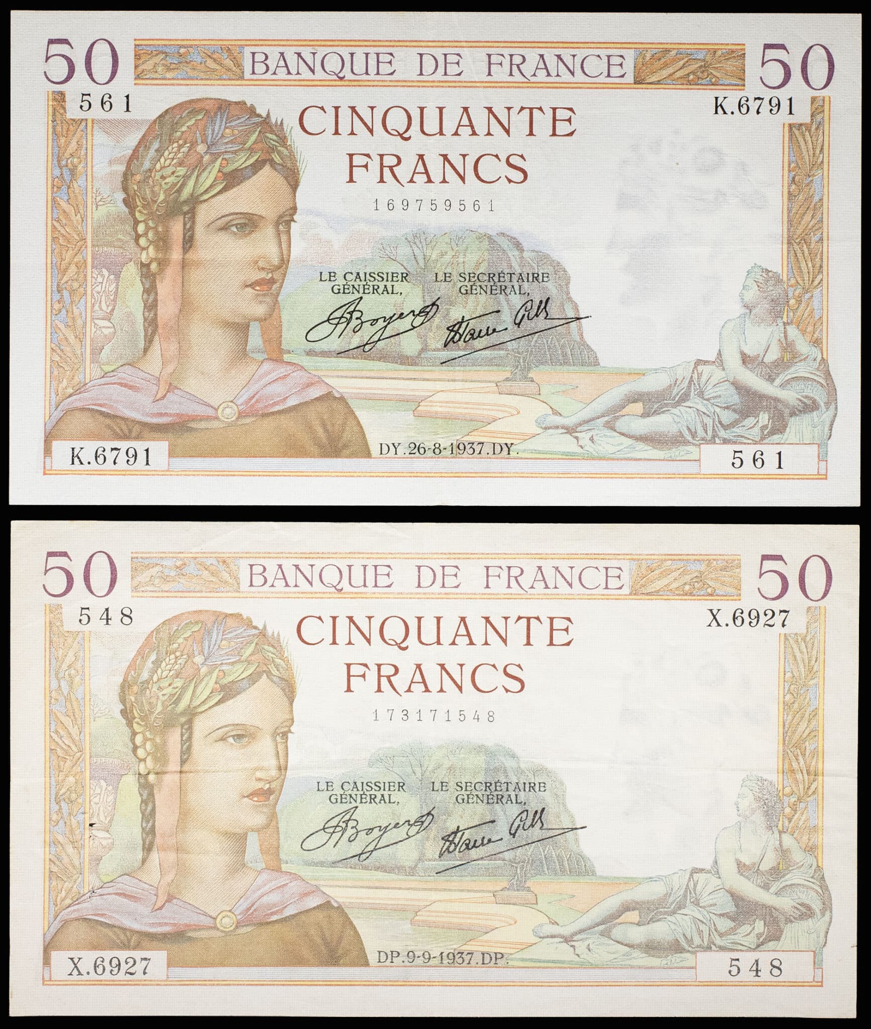 - Lot (2) - 50 francs type “Cérès” modifié 26-8-1937 et 9-9-1937.
