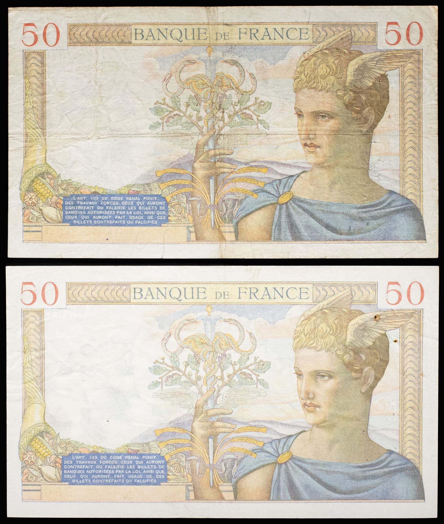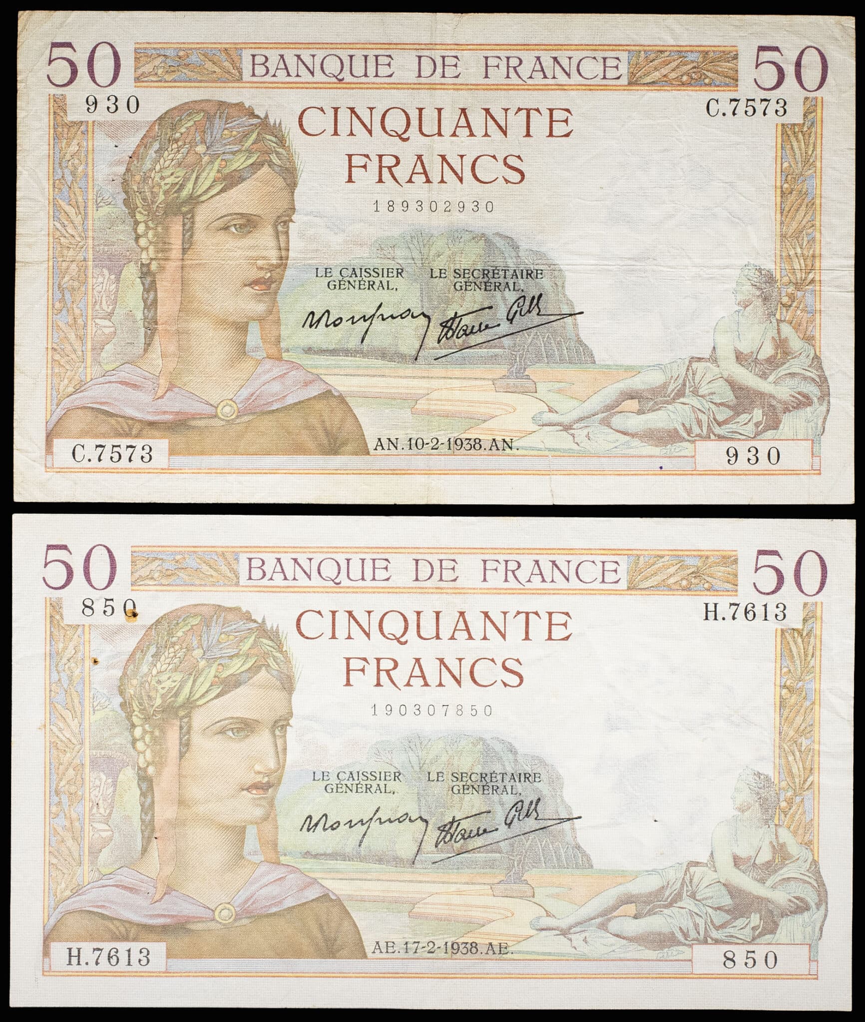 Lot (2) - 50 francs type “Cérès” modifié 10-2-1938 et 17-2-1938.