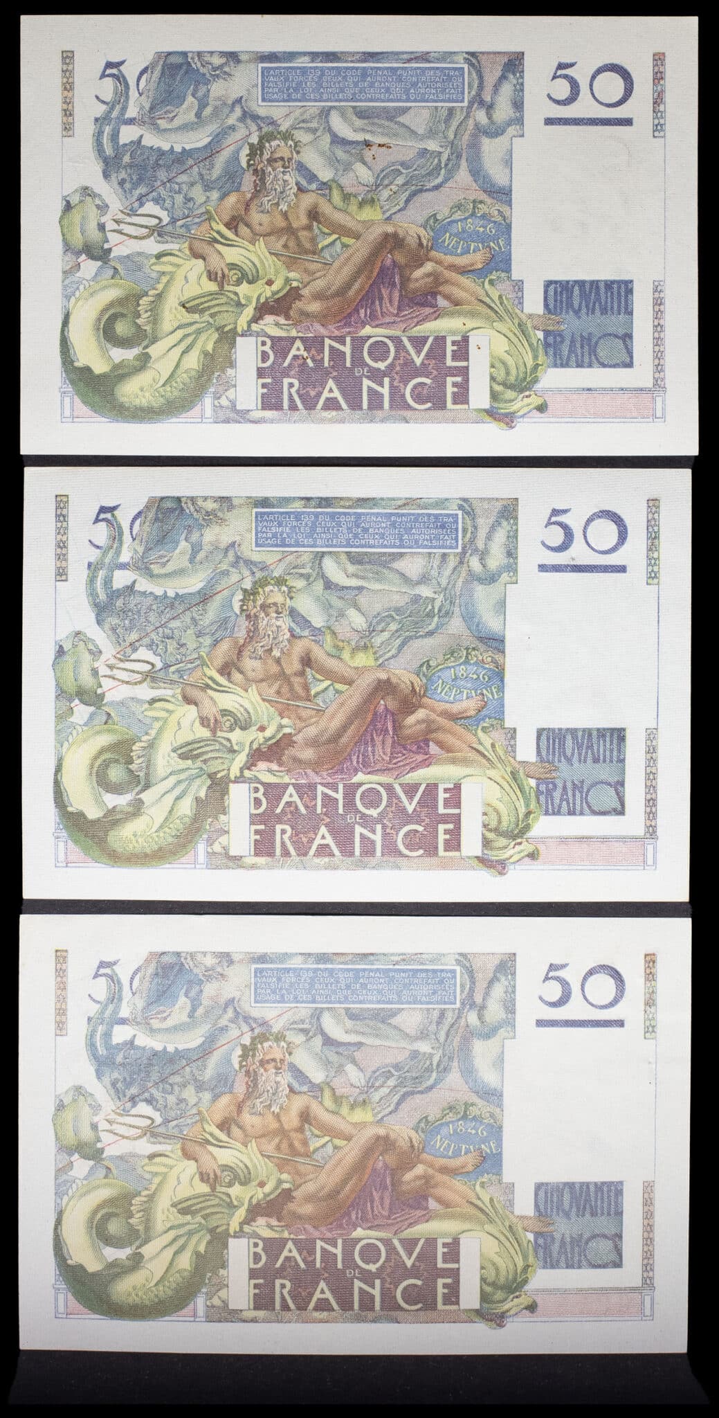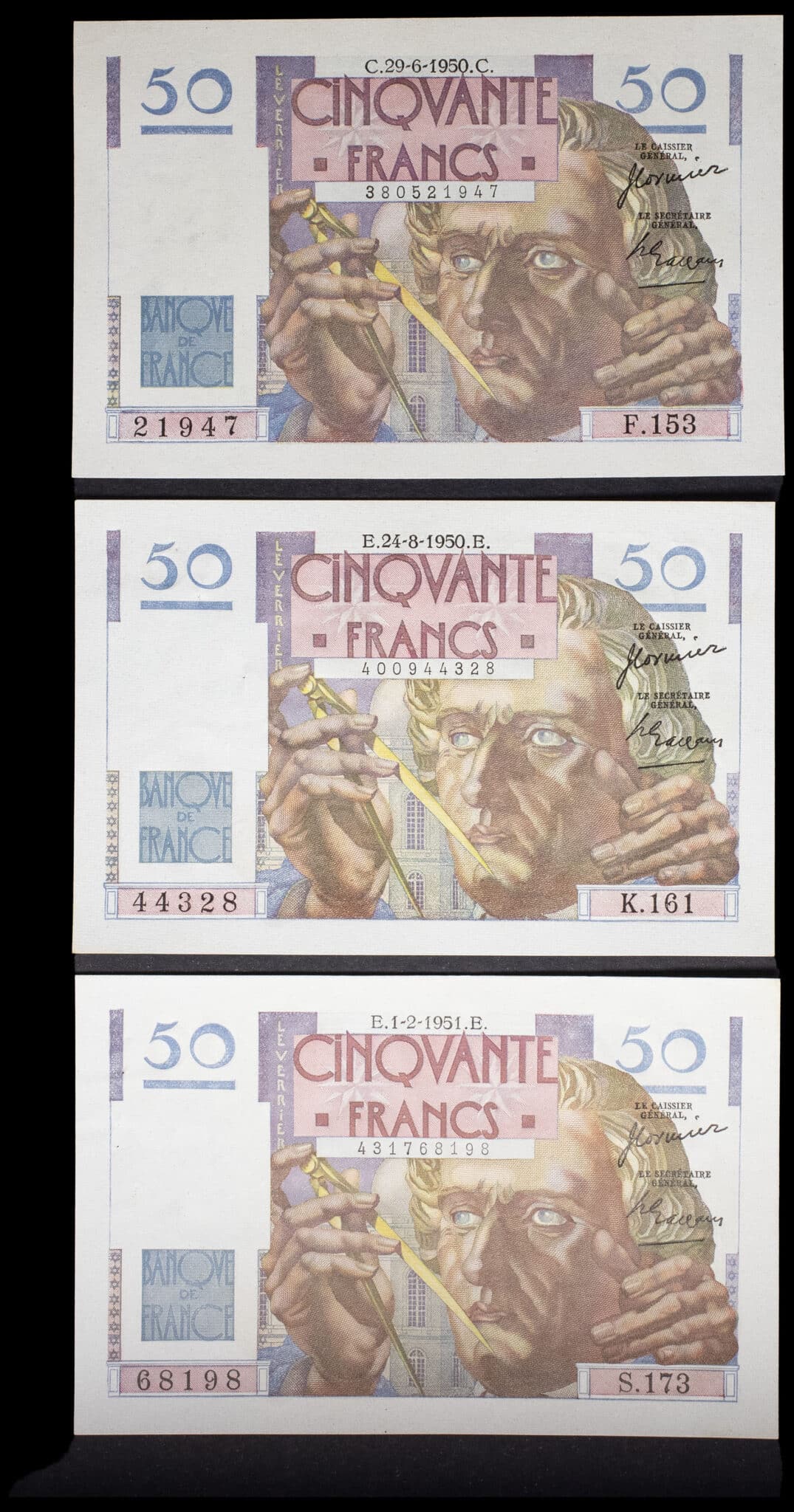 - Lot (3) - 50 francs type “Le Verrier” (signatures C) 29-6-1950 au 1-2-1951.