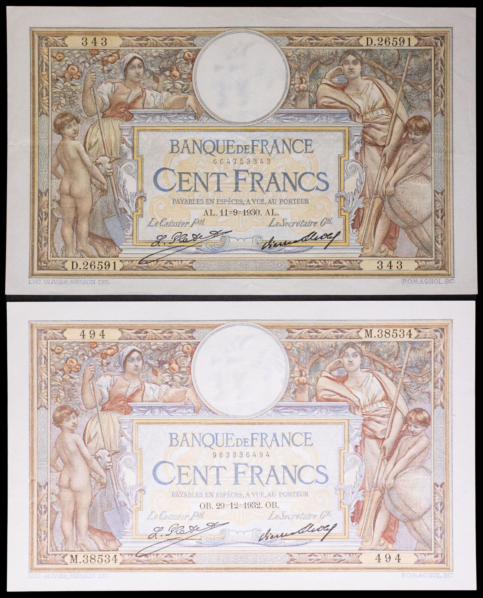 - 100 francs type “Luc-Olivier Merson” modifié avec grands cartouches 11-9-1930 et 29-12-1932.