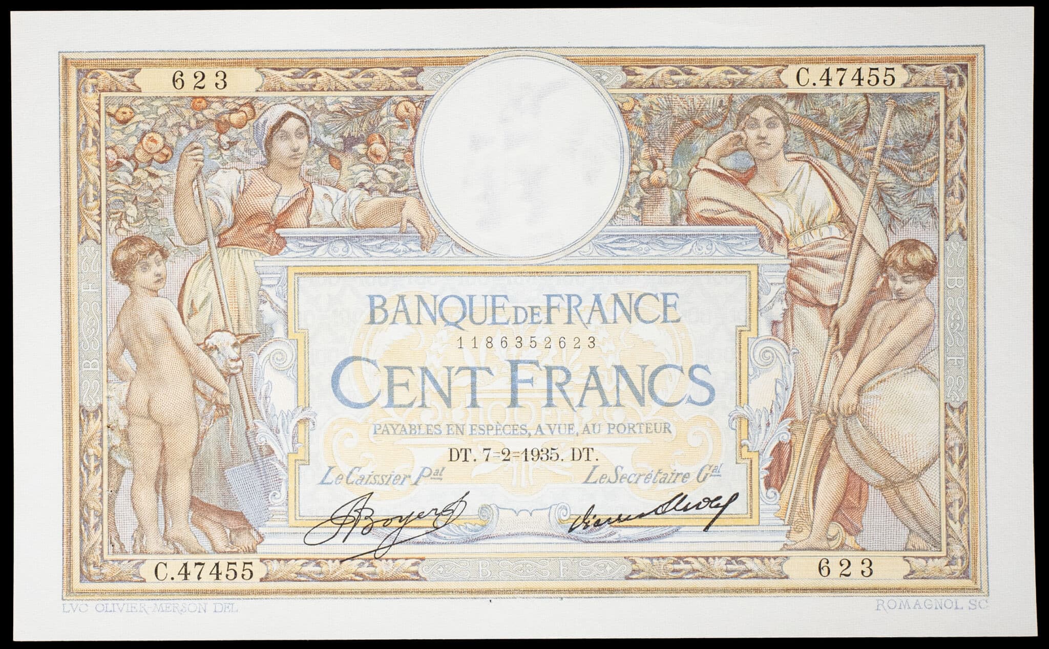 - 100 francs type “Luc-Olivier Merson” modifié avec grands cartouches 7-2-1935.