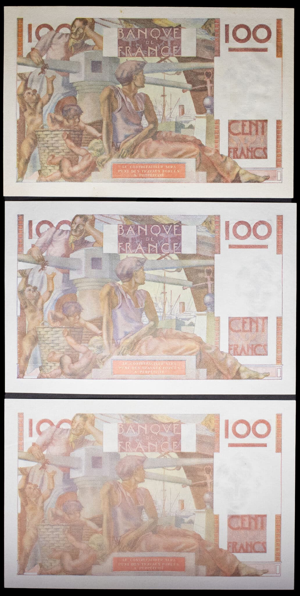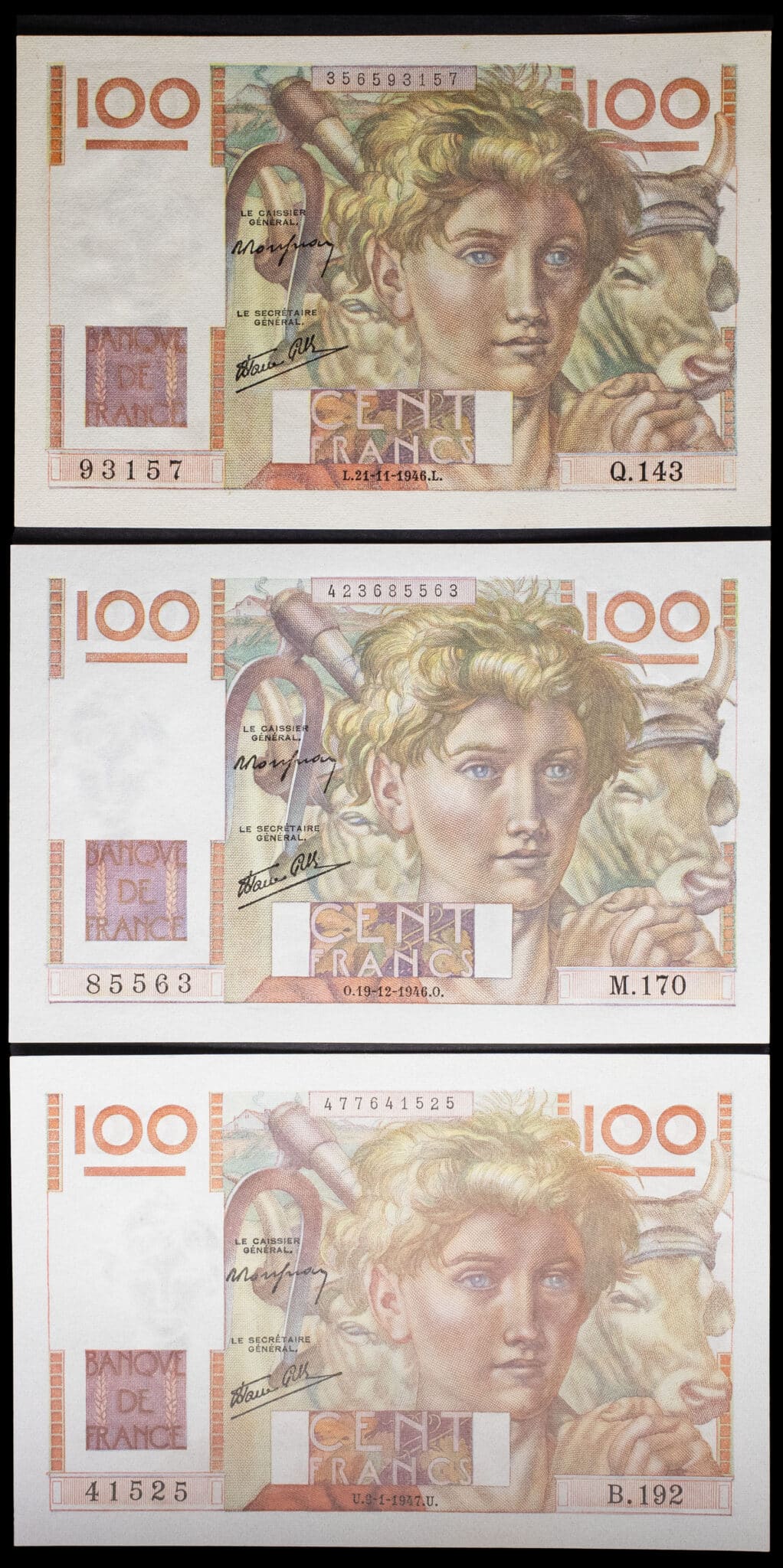 - Lot (3) - 100 francs type “jeune paysan” 21-11-1946 au 9-1-1947.