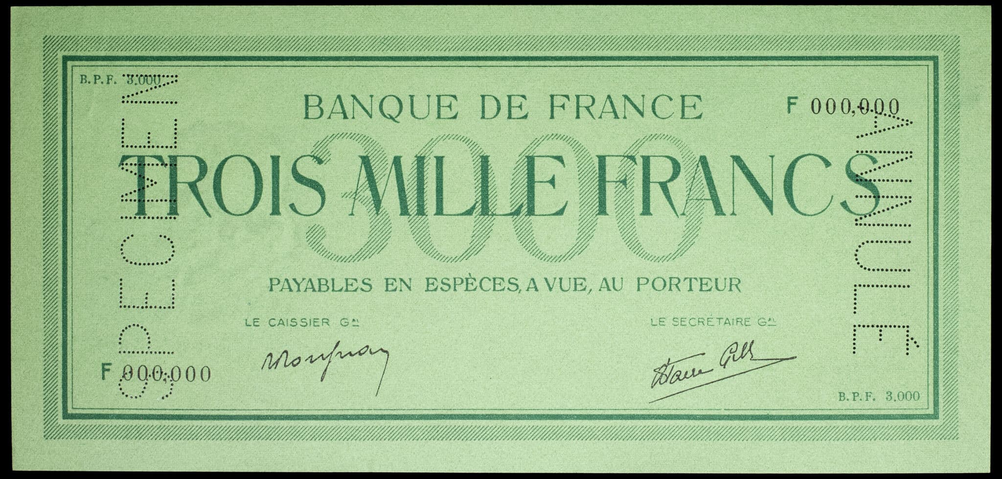 - 3000 francs type “vert” non émis (SPÉCIMEN ANNULÉ / CANCELLED) ND (1938).