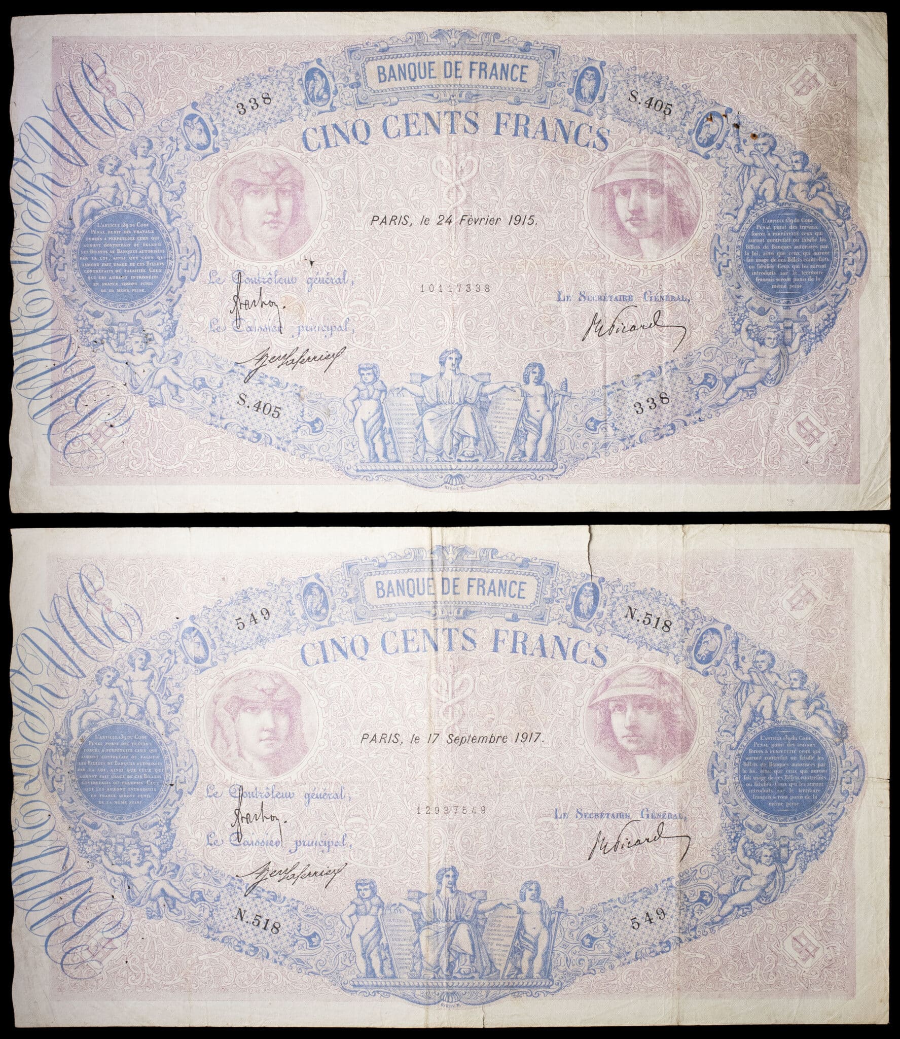 - Lot (2) - 500 francs type “bleu et rose” 24 février 1915 et 17 septembre 1917.