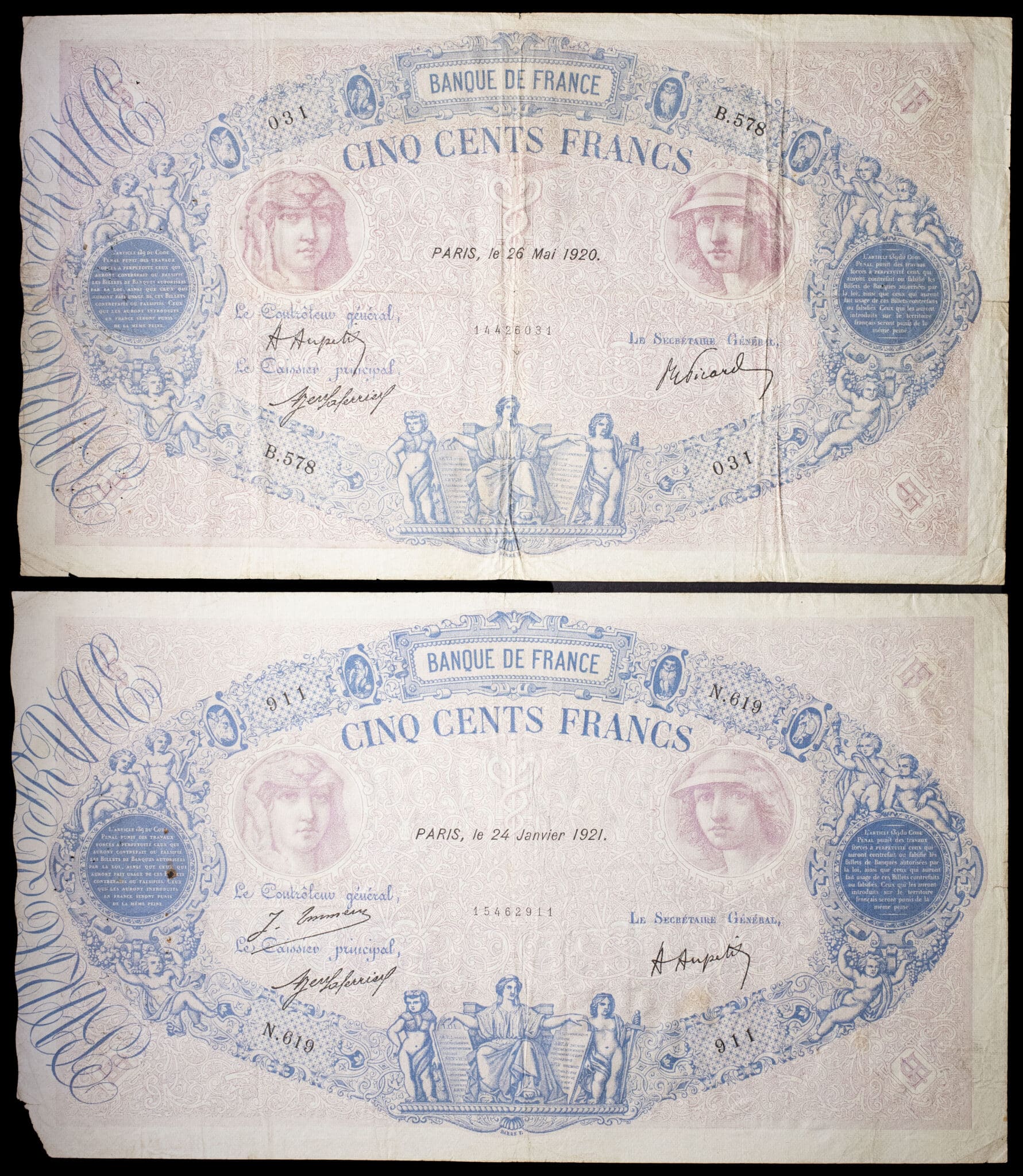 - Lot (2) - 500 francs type “bleu et rose” 26 mai 1920 et 24 janvier 1921.