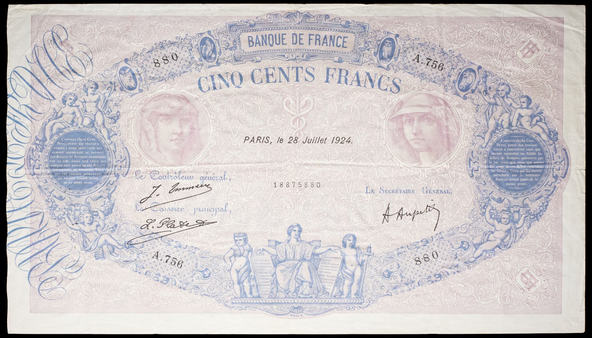 - 500 francs type “bleu et rose” 28 juillet 1924.