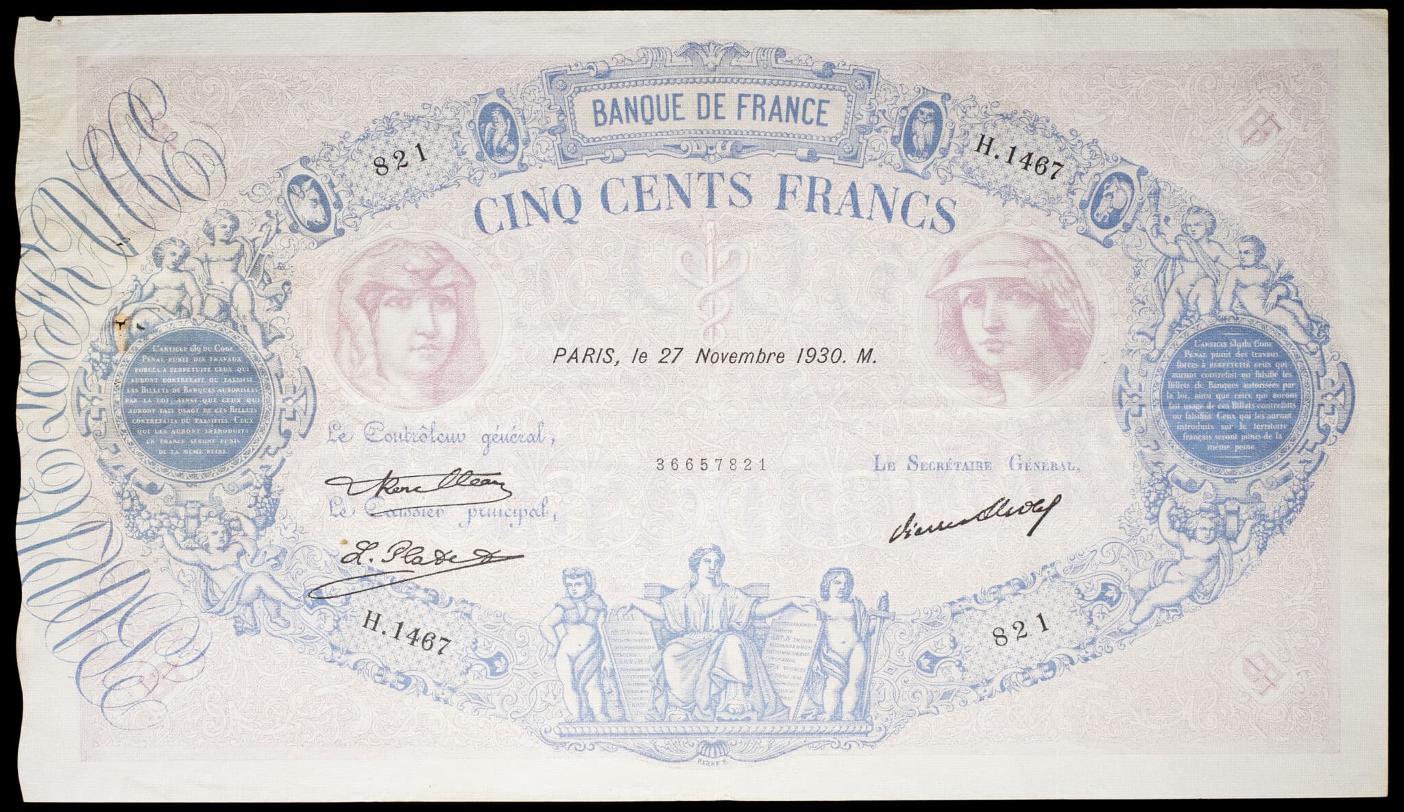 - 500 francs type “bleu et rose” 27 novembre 1930.