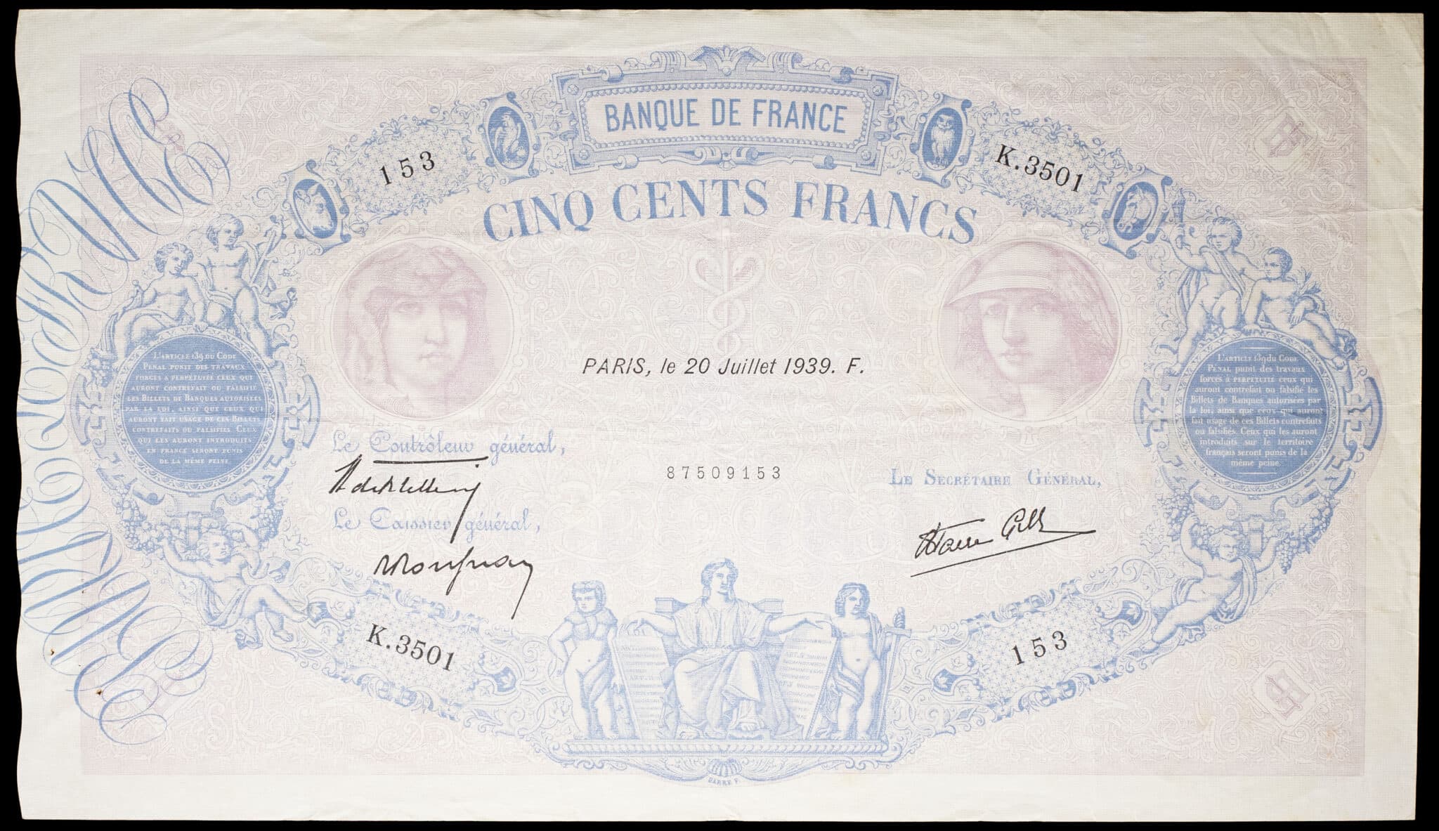 - 500 francs type “bleu et rose” modifié 20 juillet 1939.