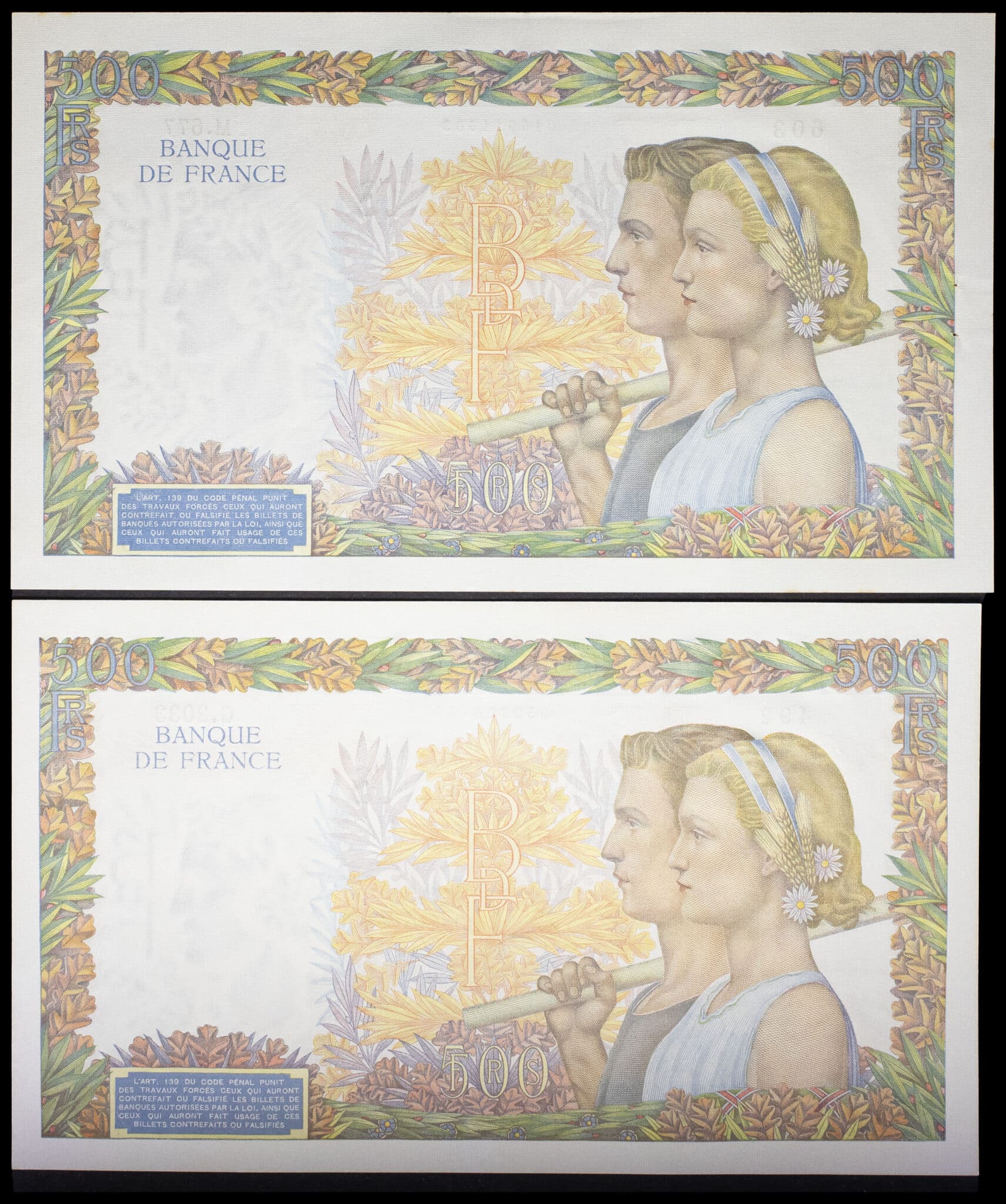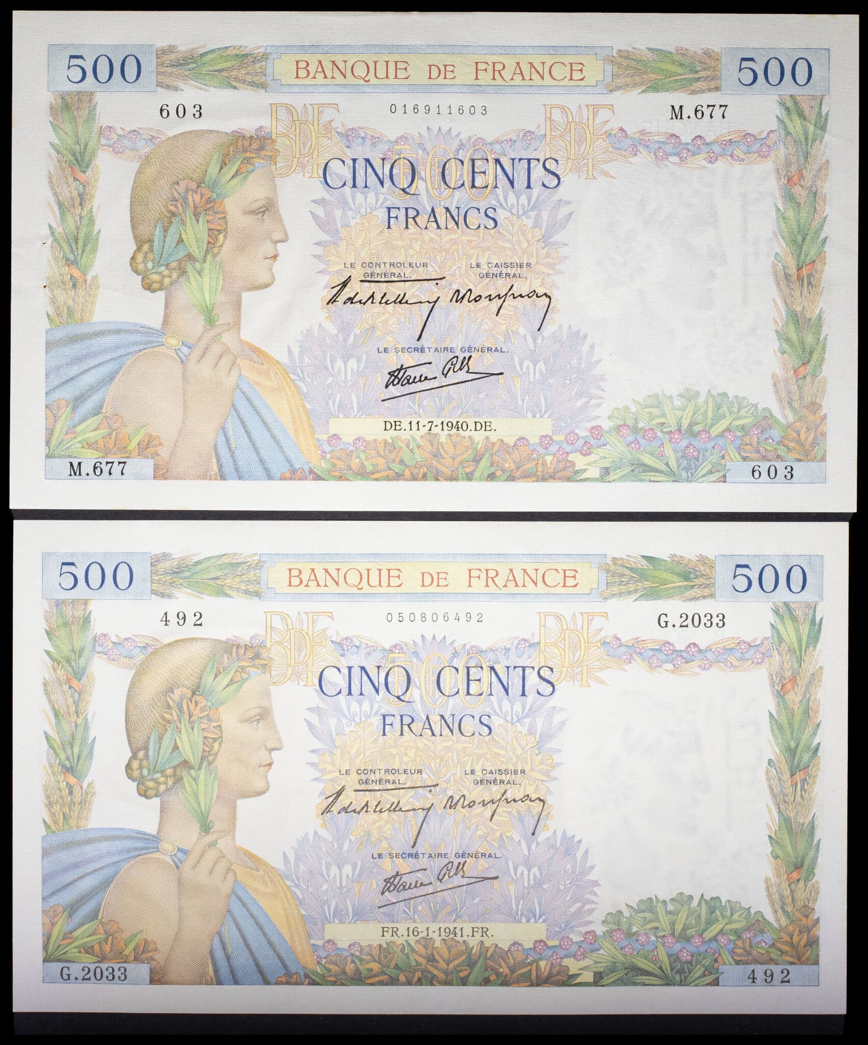 - Lot (2) - 500 francs type “La Paix” 11-7-1940 et 16-1-1941.