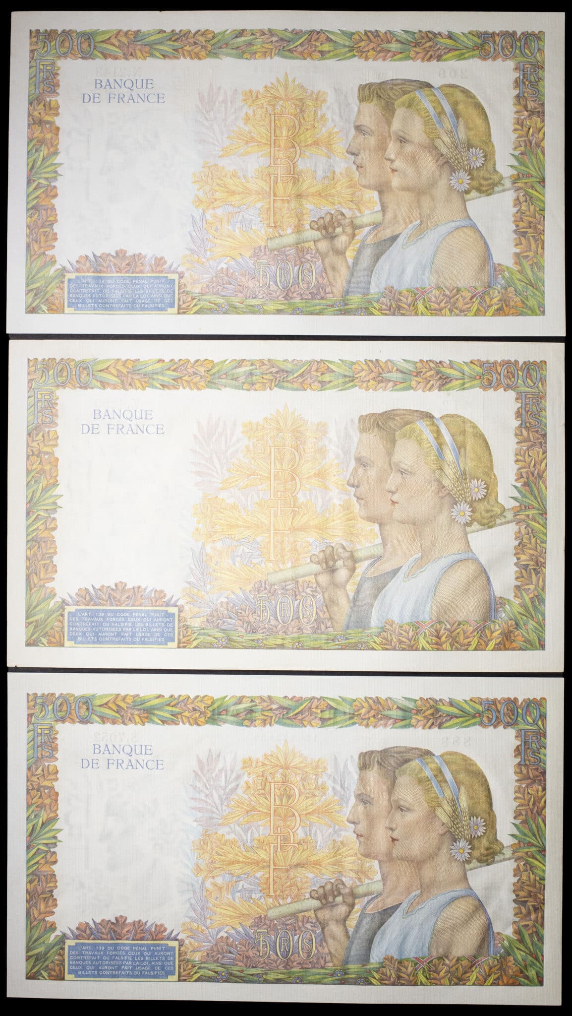 - Lot (3) - 500 francs type “La Paix” 6-2-1941 au 1-10-1942.
