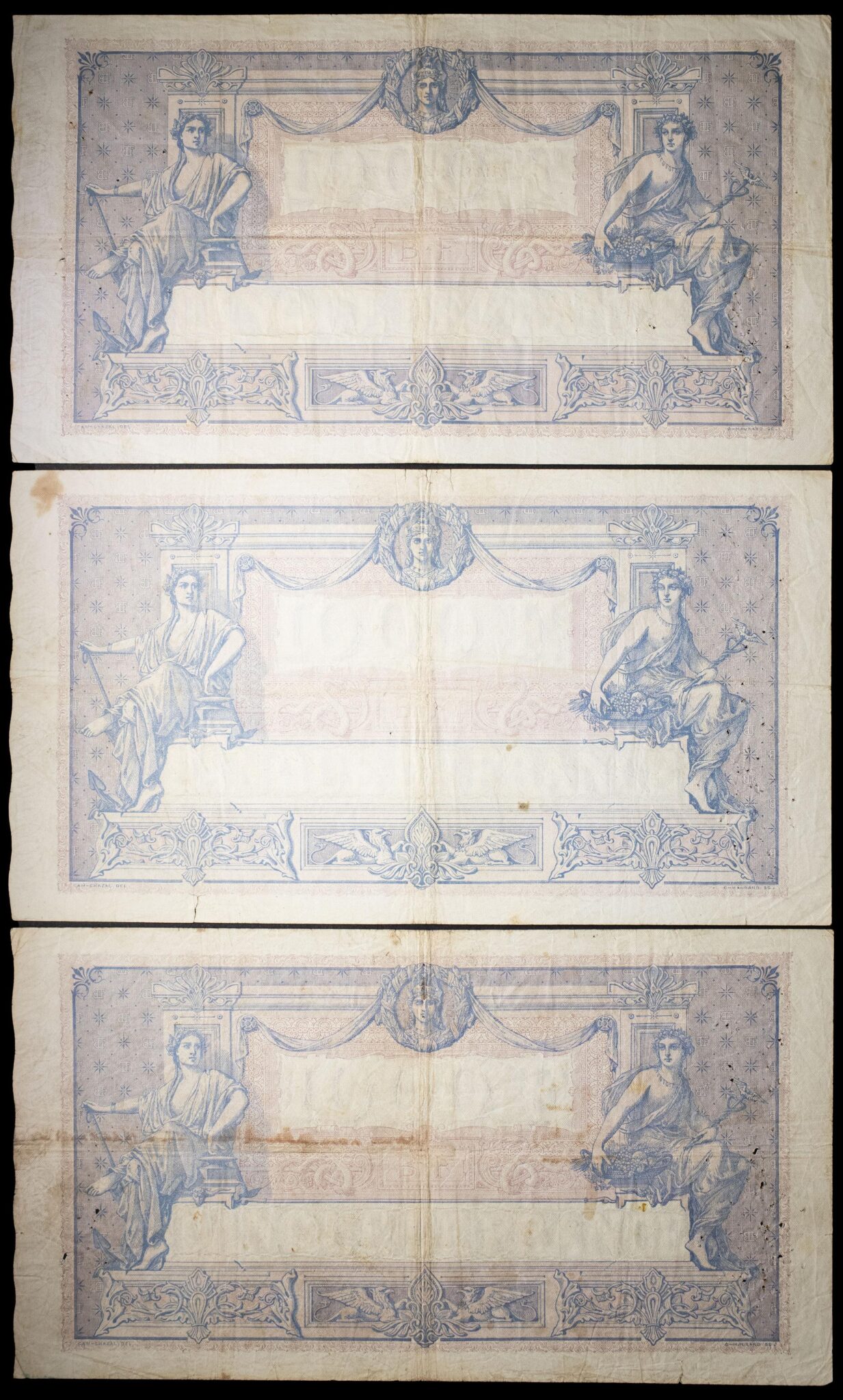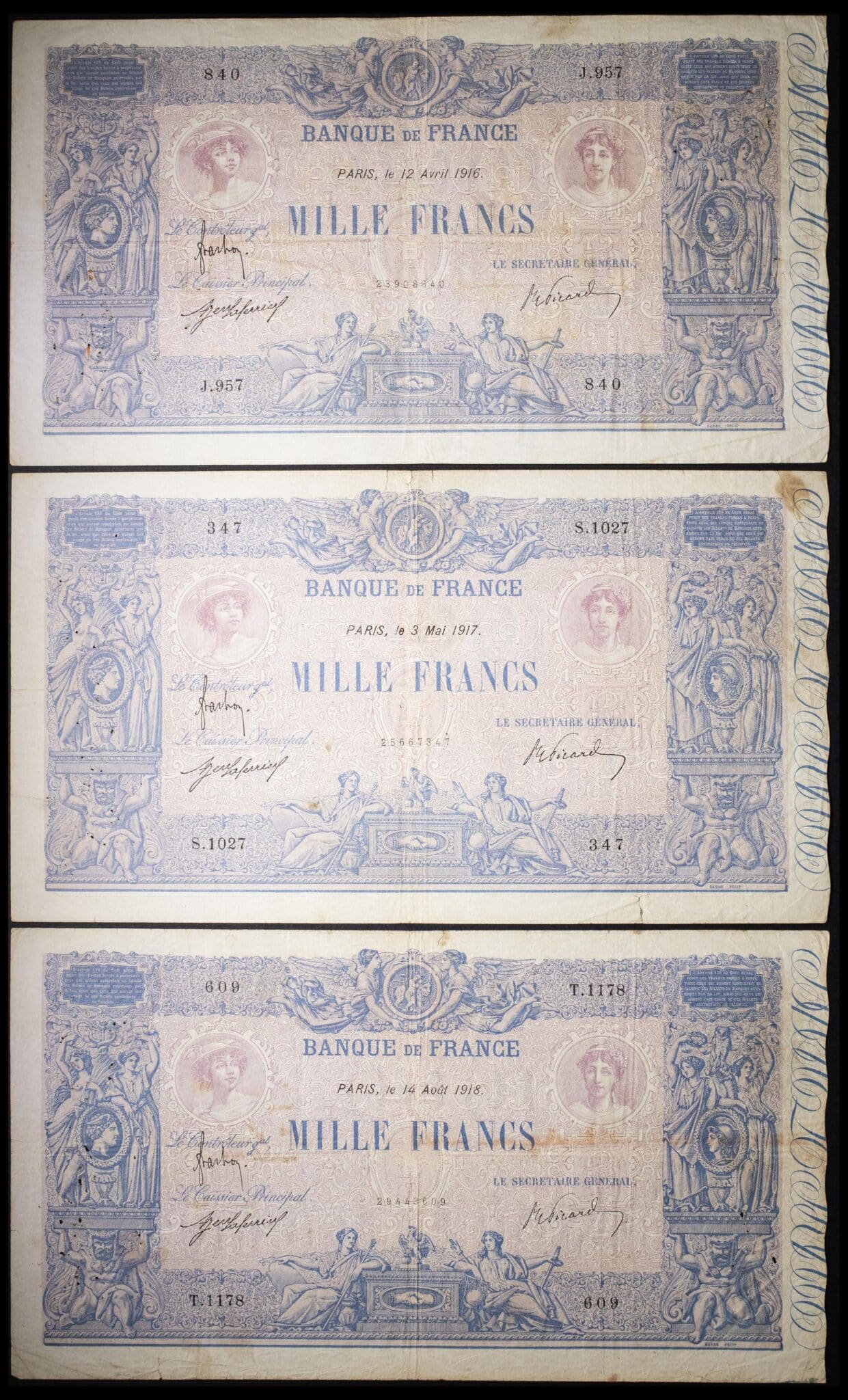 - Lot (3) - 1000 francs type “bleu et rose” 12 avril 1916 au 14 août 1918.