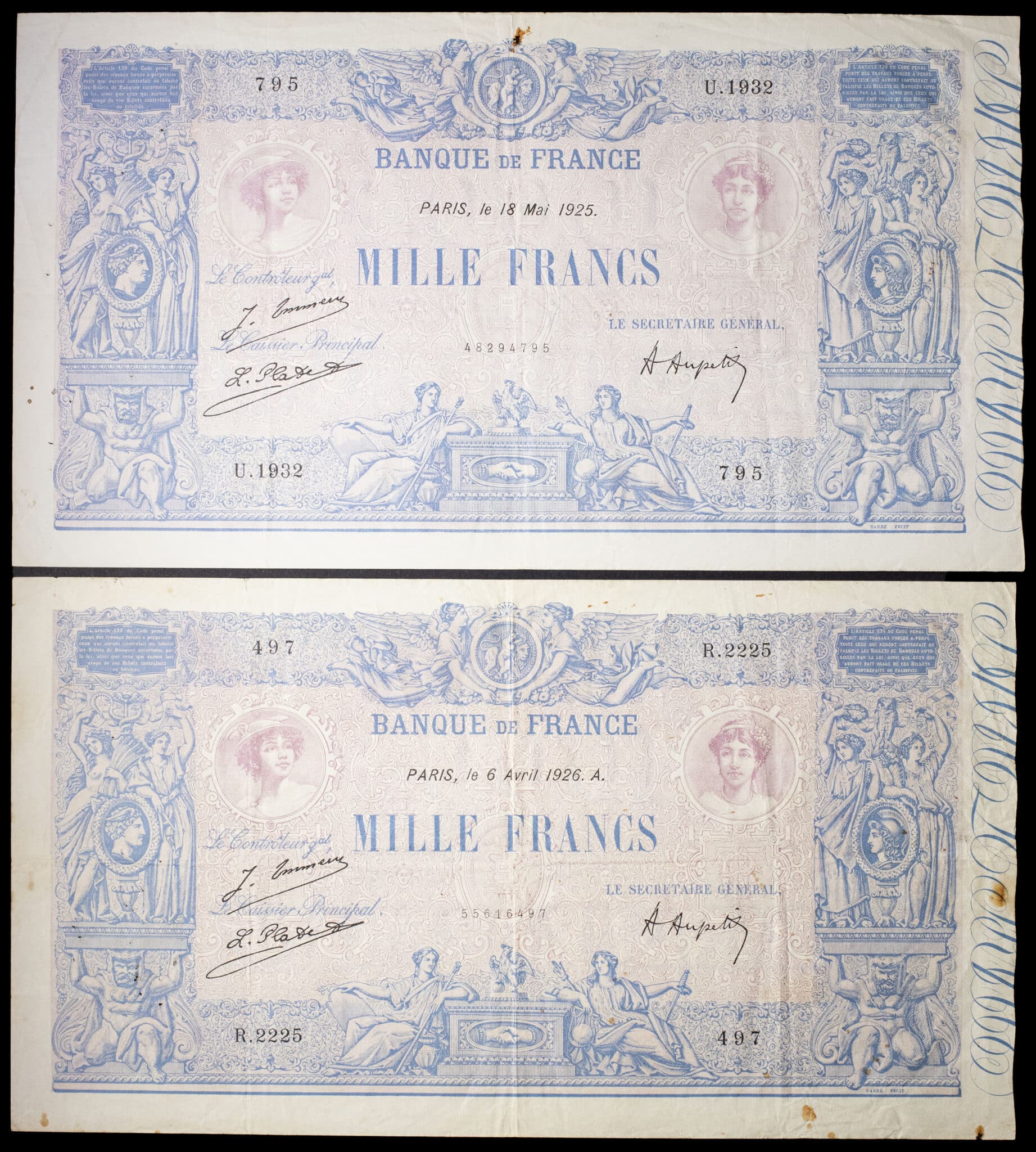 - Lot (2) - 1000 francs type “bleu et rose” 18 mai 1925 et 6 avril 1926.