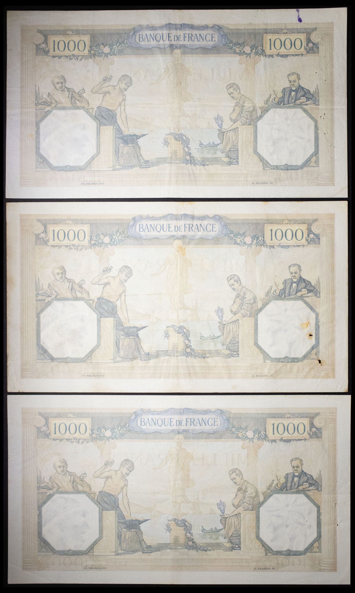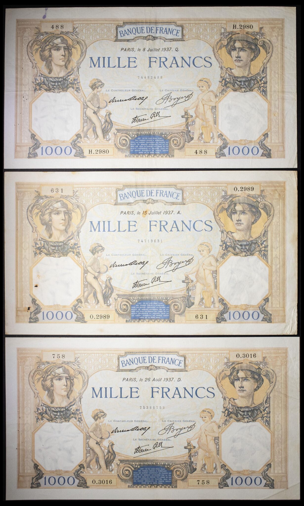 - Lot (3) - 1000 francs type “Cérès et Mercure” modifié (signatures A) 8 juillet au 26 août 1937.