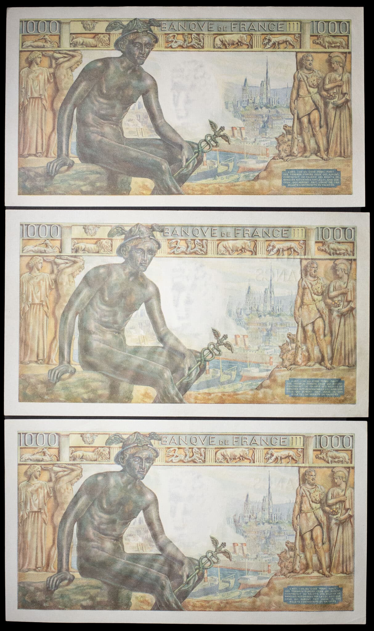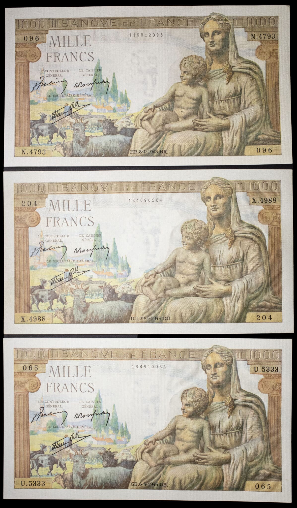 - Lot (3) - 1000 francs type “Déesse Déméter” 8-4-1943 au 6-5-1943.