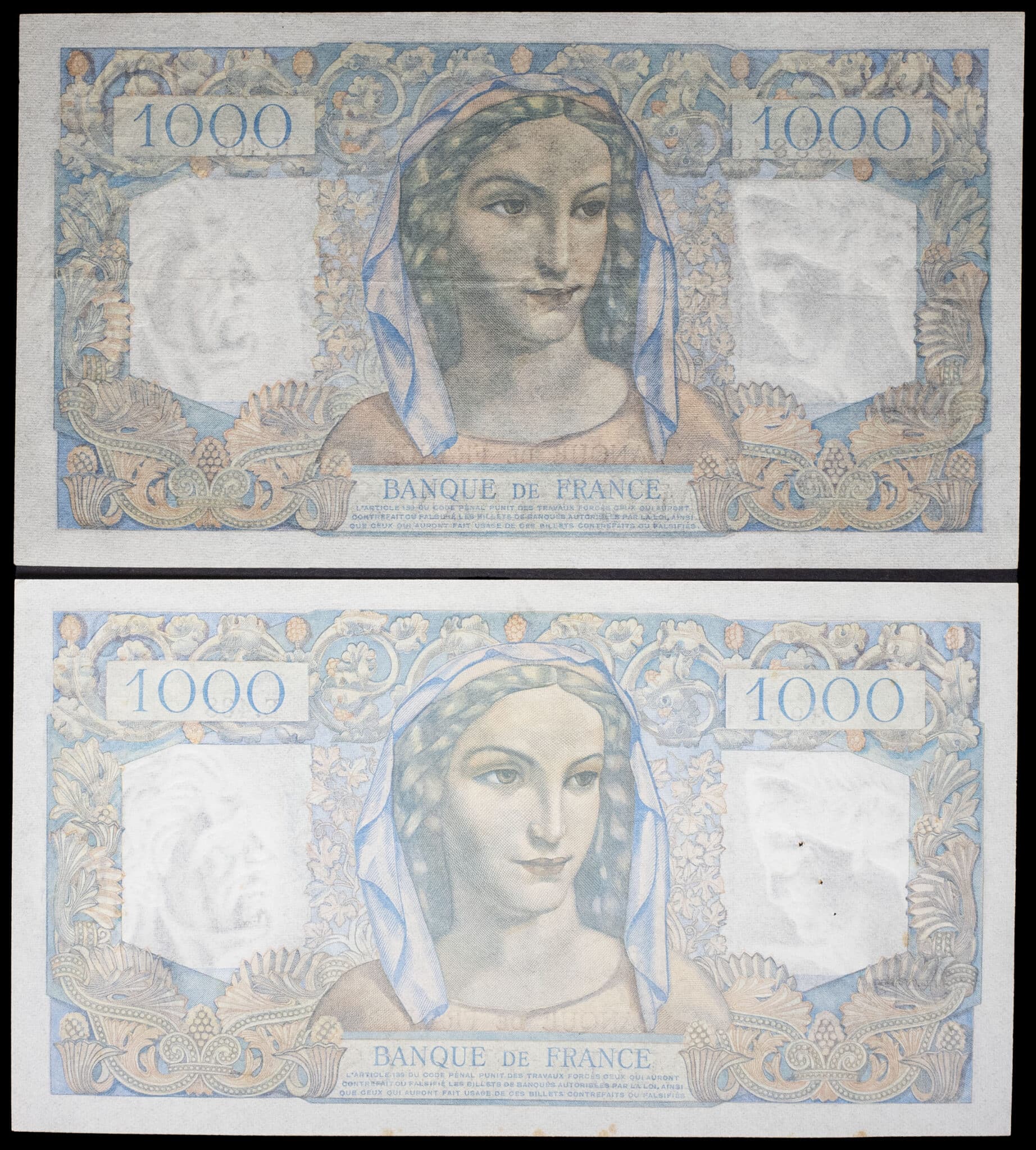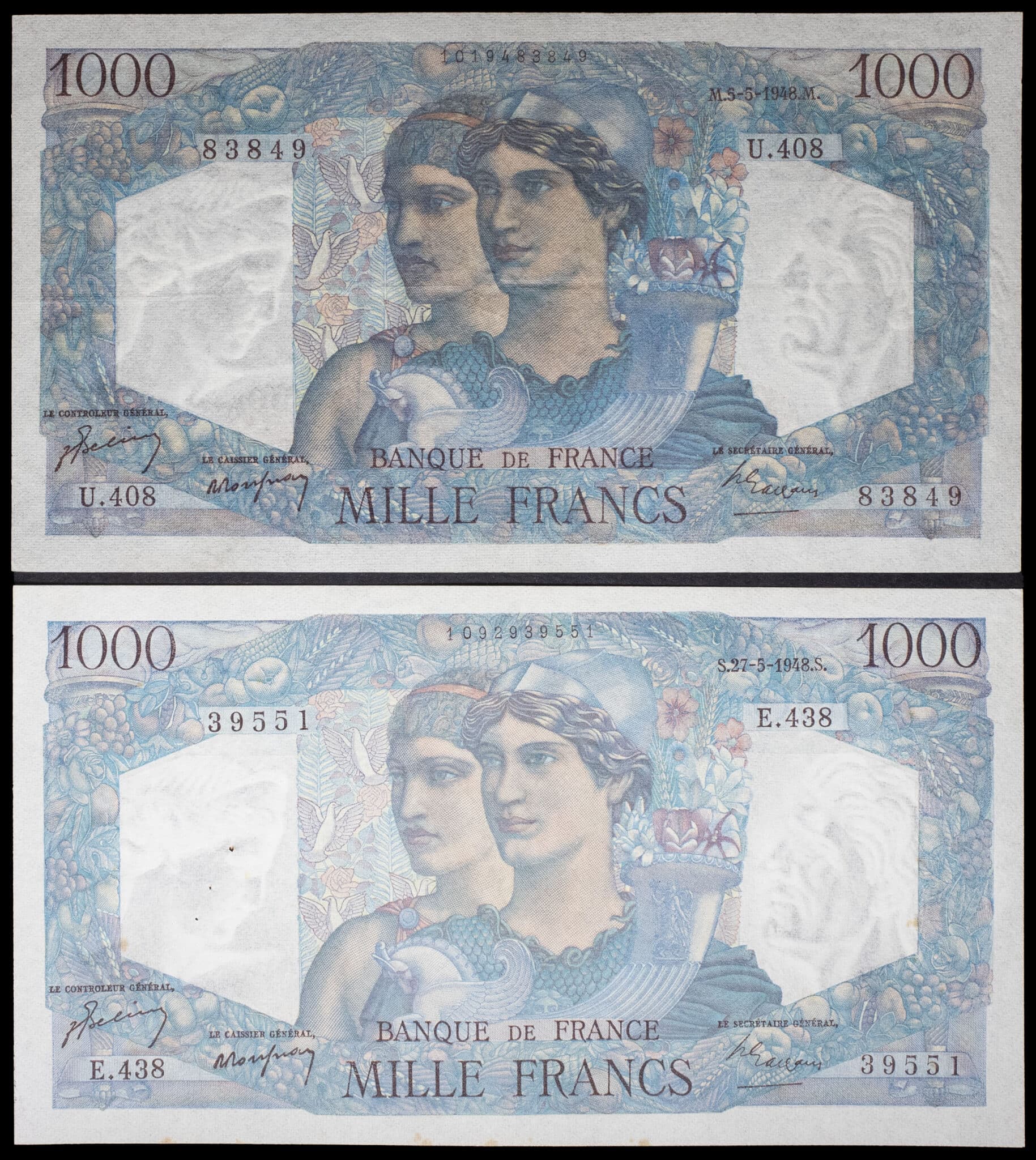 - Lot (2) - 1000 francs type “Minerve et Hercule” 5-5-1948 et 27-5-1948.