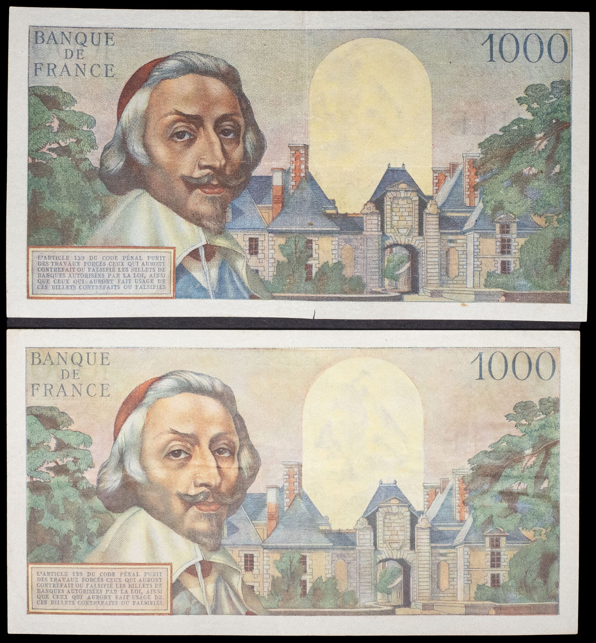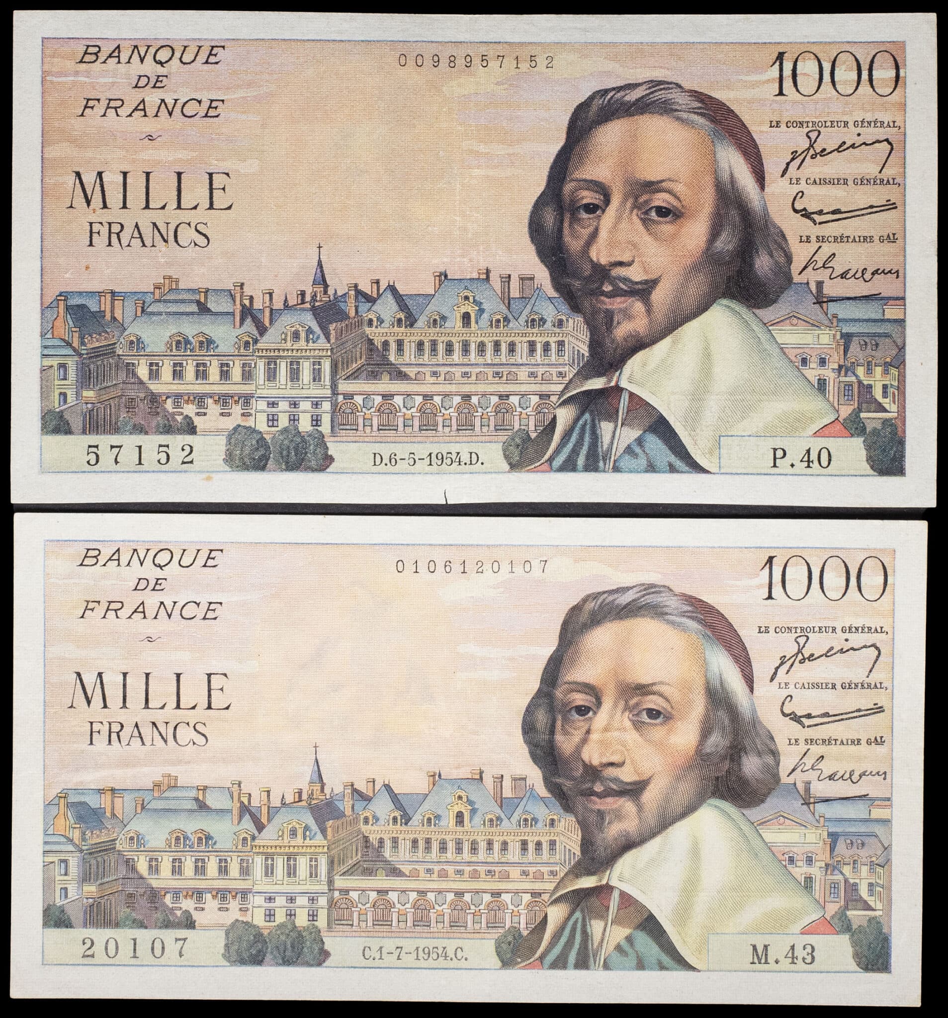 - Lot (2) - 1000 francs type “Richelieu” 6-5-1954 et 1-7-1954.