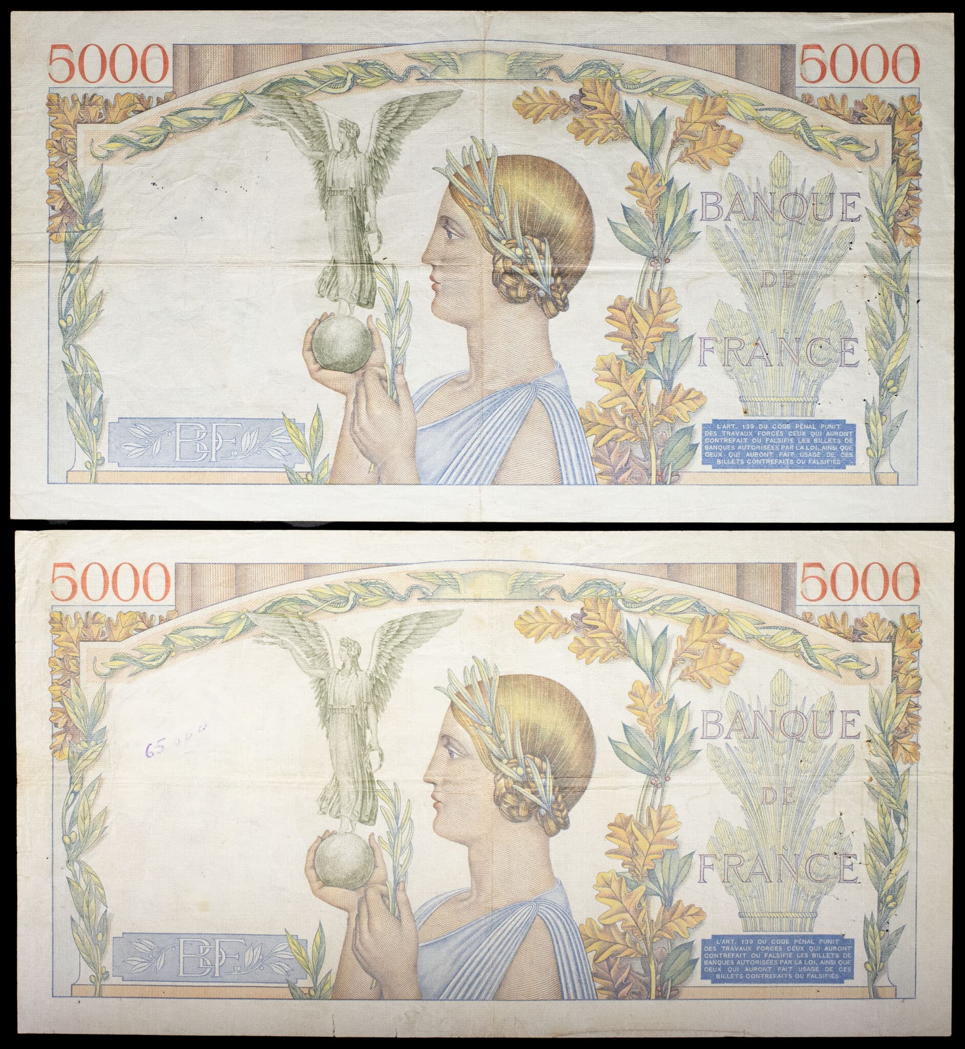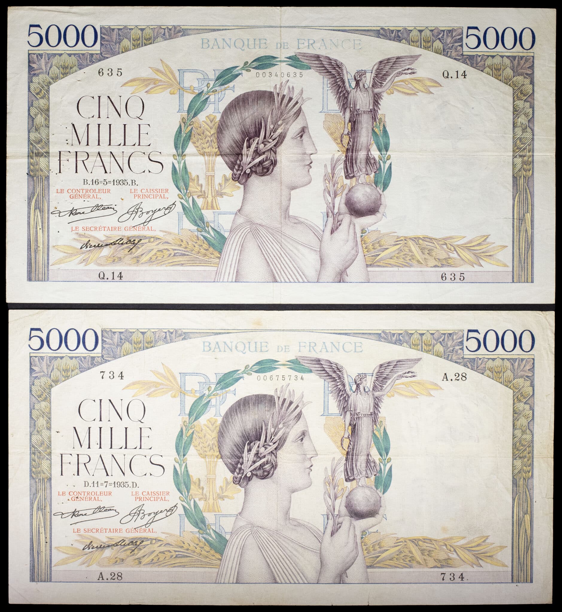 - Lot (2) - 5000 francs type “Victoire” 16-5-1935 et 11-7-1935.