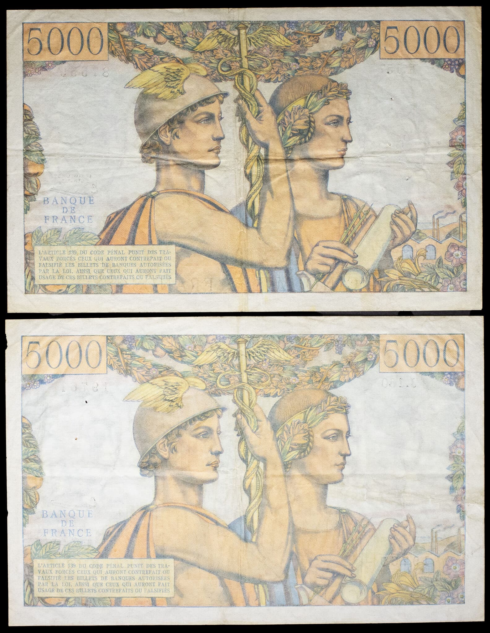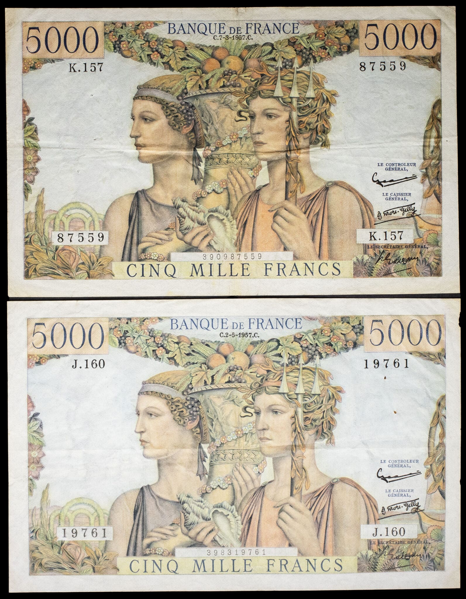 - Lot (2) - 5000 francs type “Terre et Mer” 7-3-1957 et 2-5-1957.