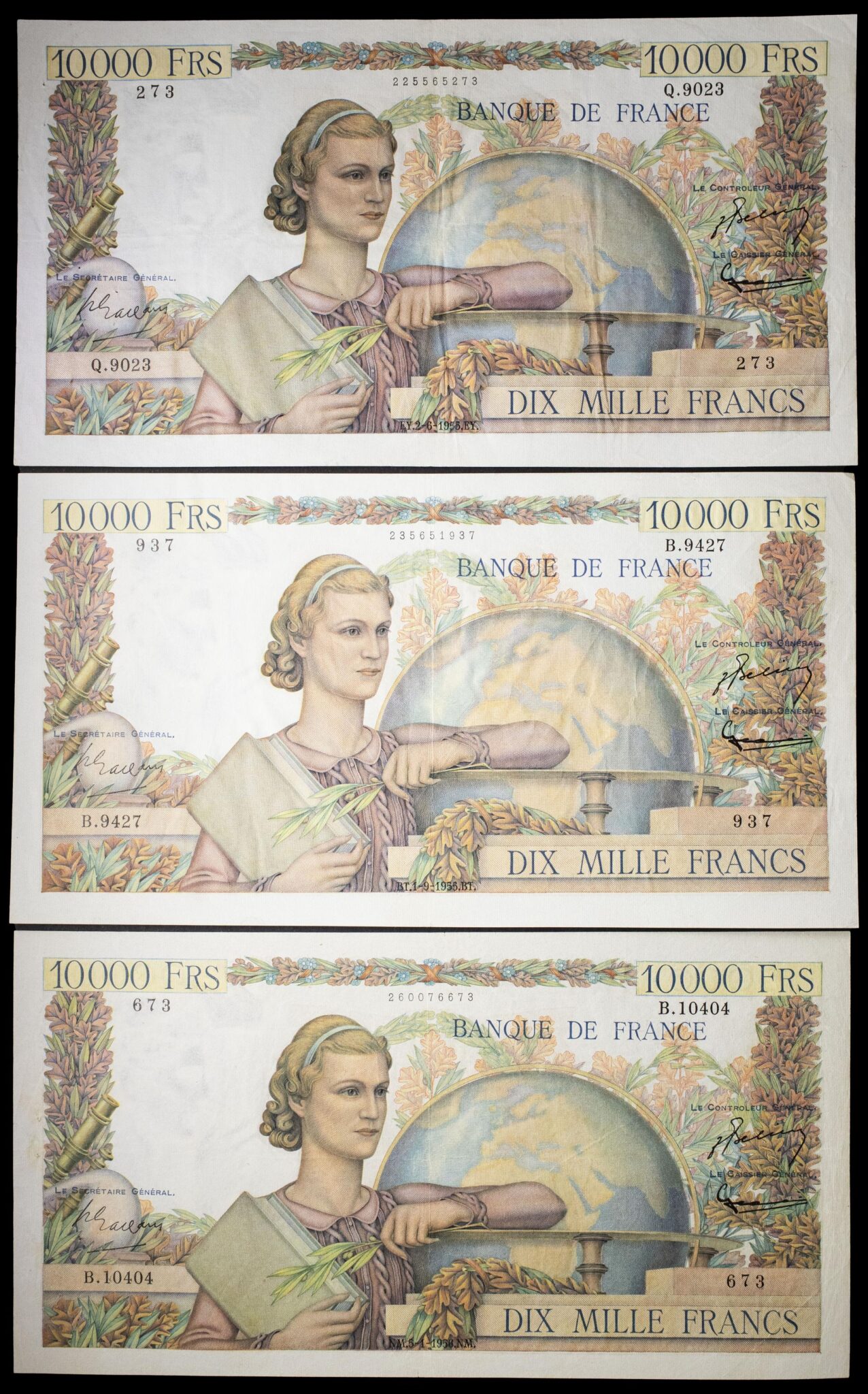 - Lot (3) - 10 000 francs type “Génie français” 2-6-1955 au 5-1-1956.