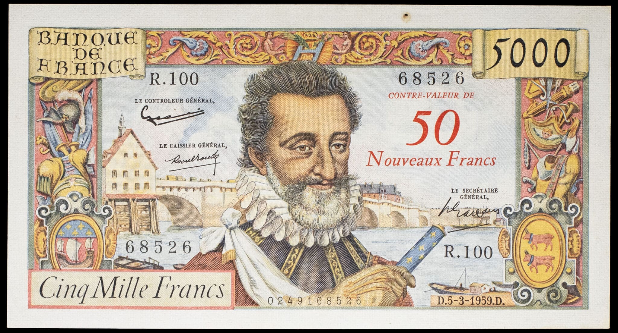 - 50 nouveaux francs surchargé sur 5000 francs type “Henri IV” 5-3-1959.