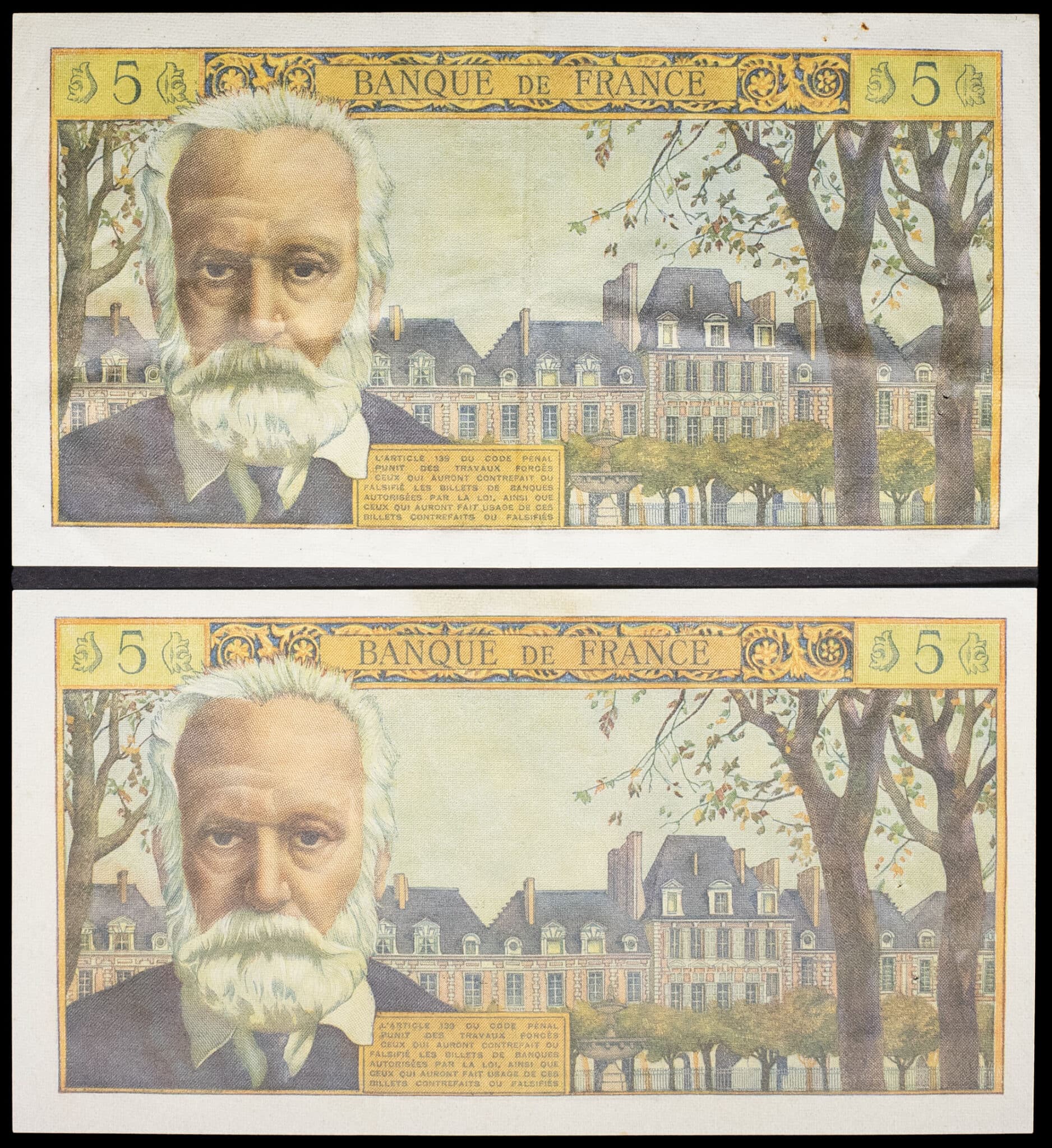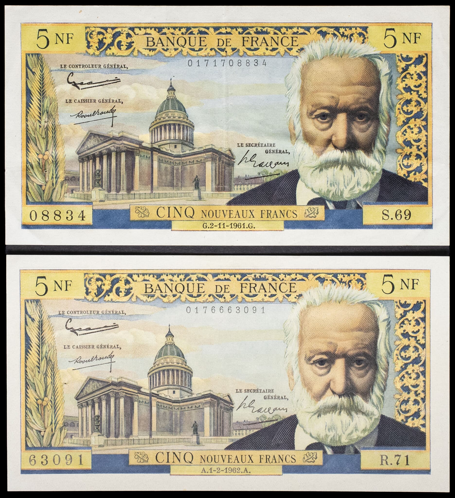 - Lot (2) - 5 nouveaux francs type “Victor Hugo” 2-11-1961 et 1-2-1962.