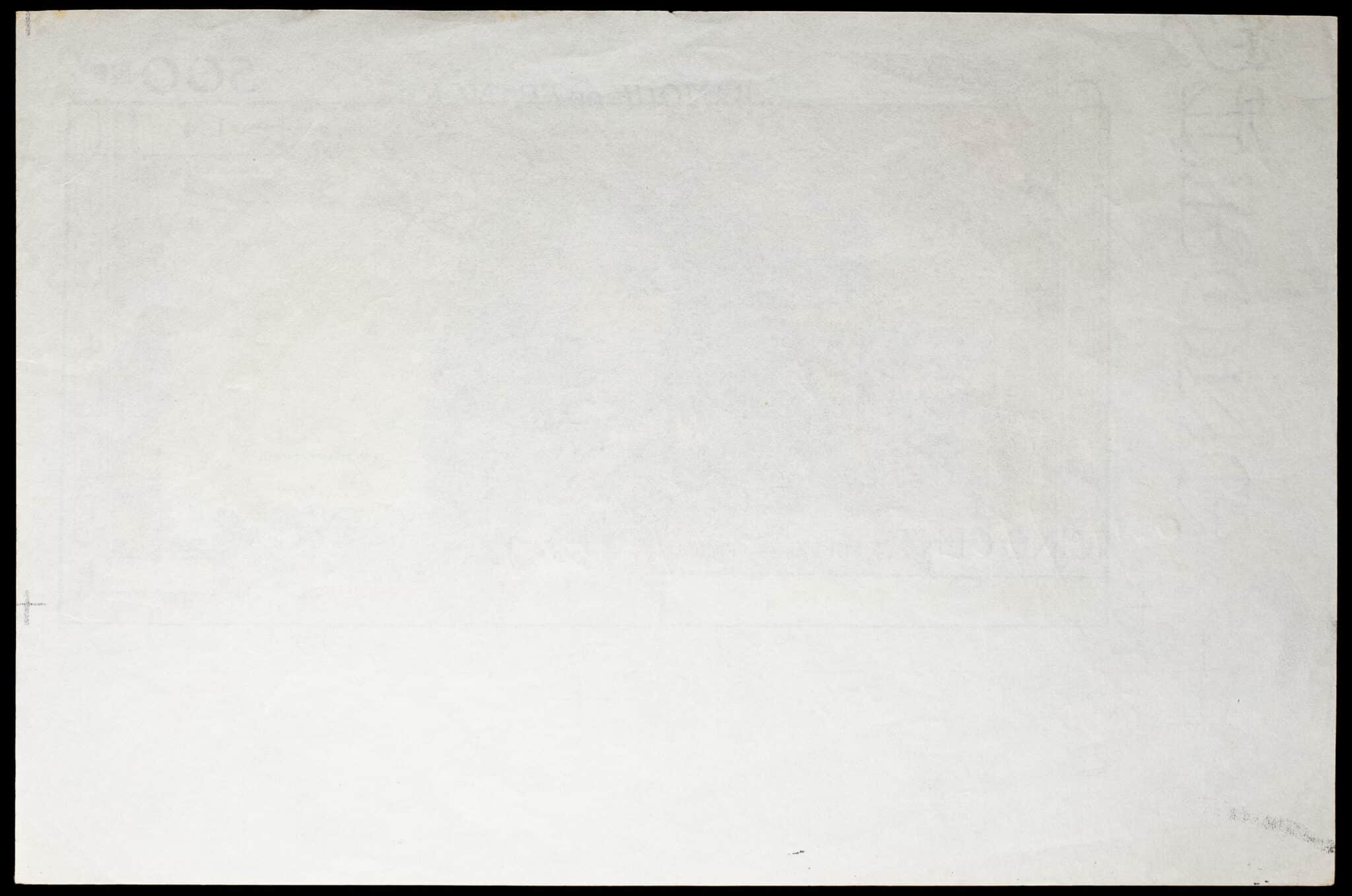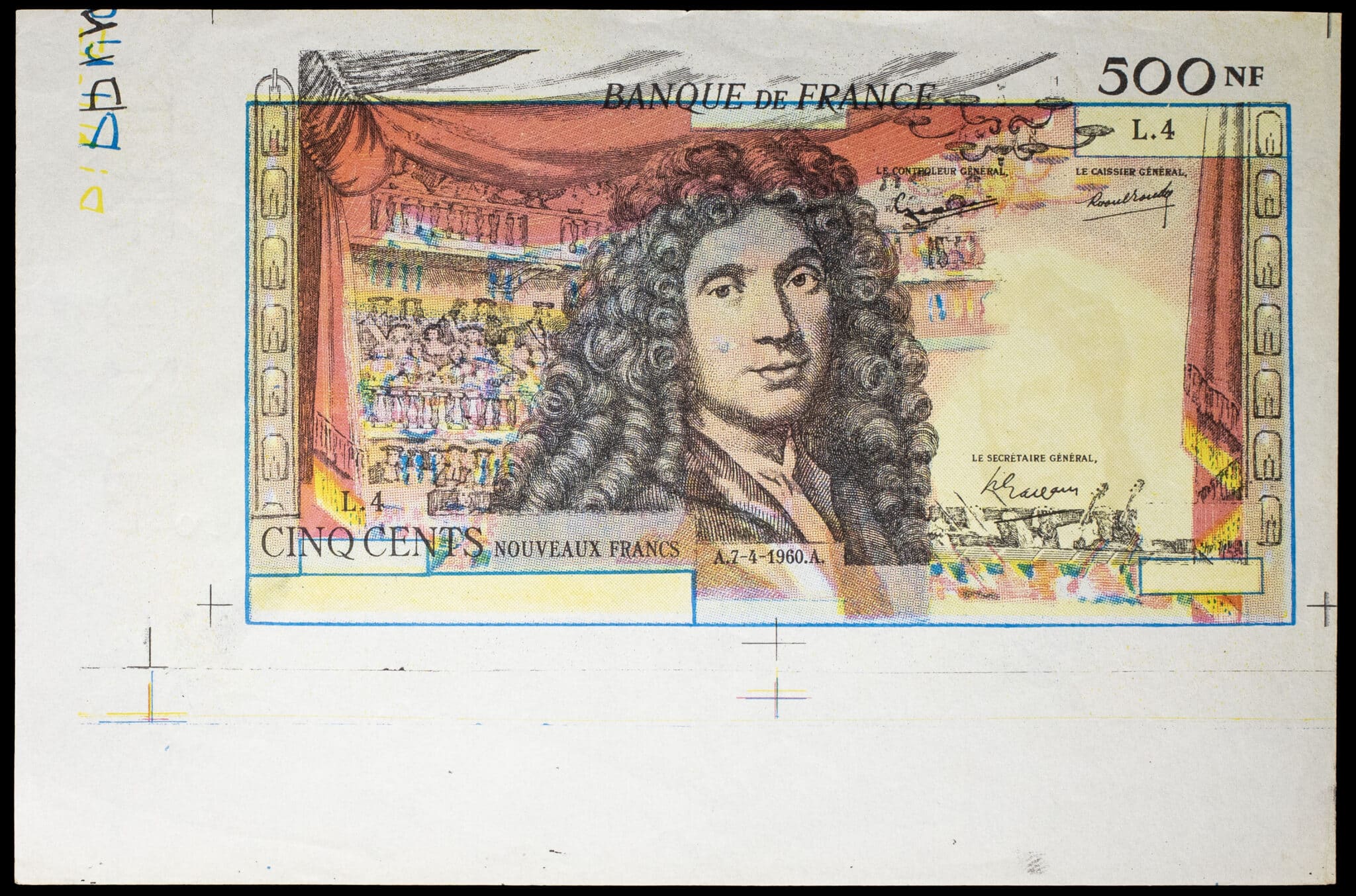 - Test d’impression de recto de 500 nouveaux francs type “Molière” avec décalage de l’encre noire 7-4-1960.