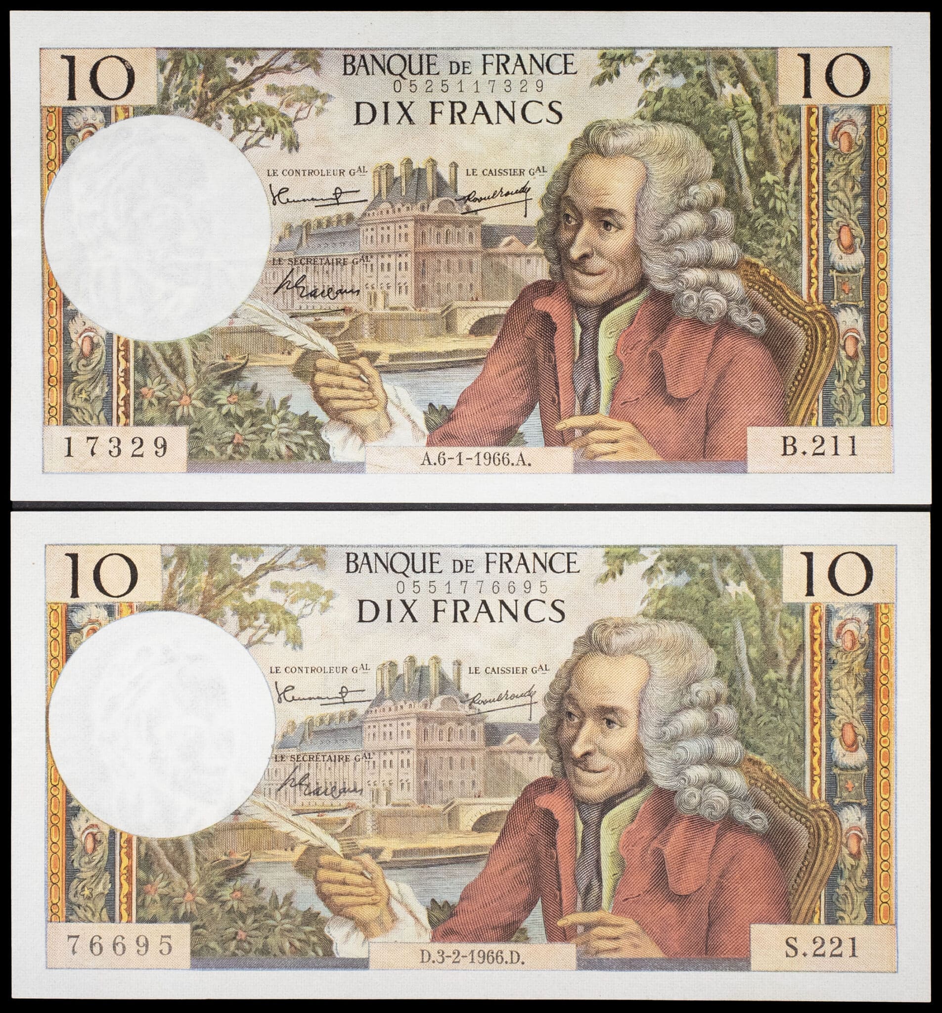 - Lot (2) - 10 francs type "Voltaire" 6-1-1966 et 3-2-1966.