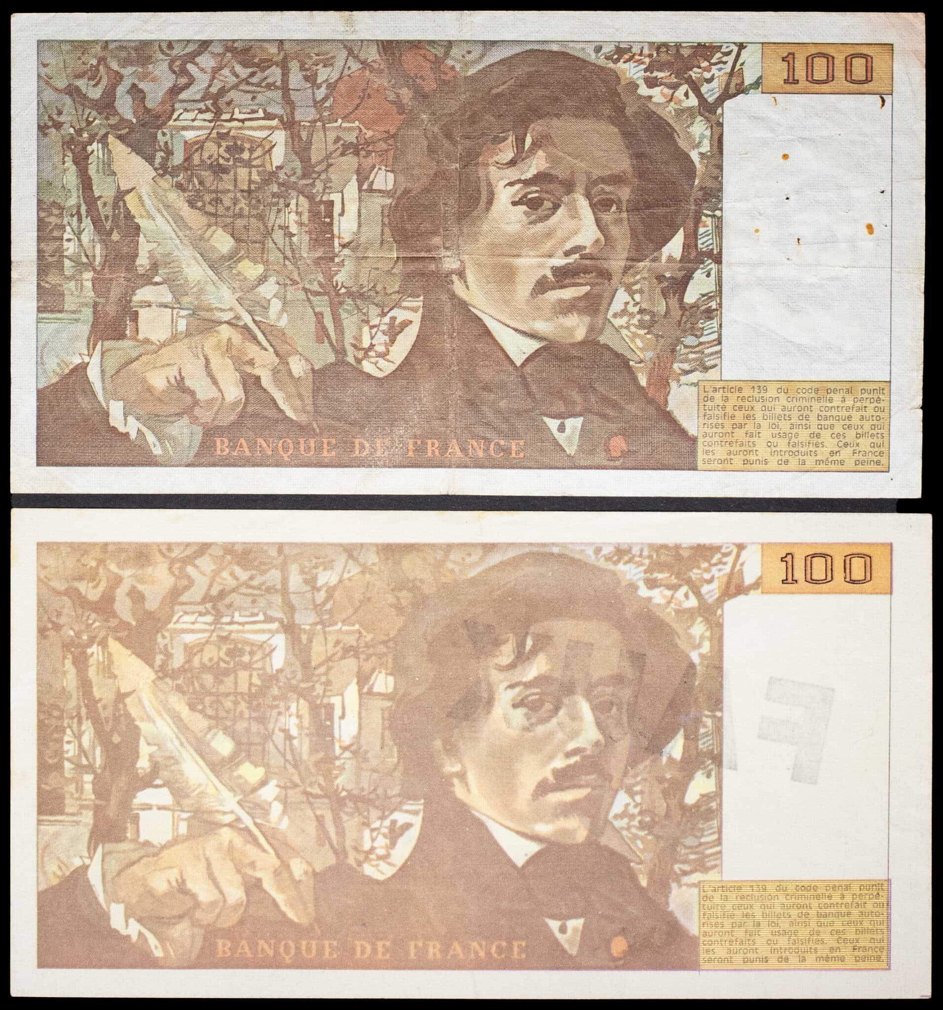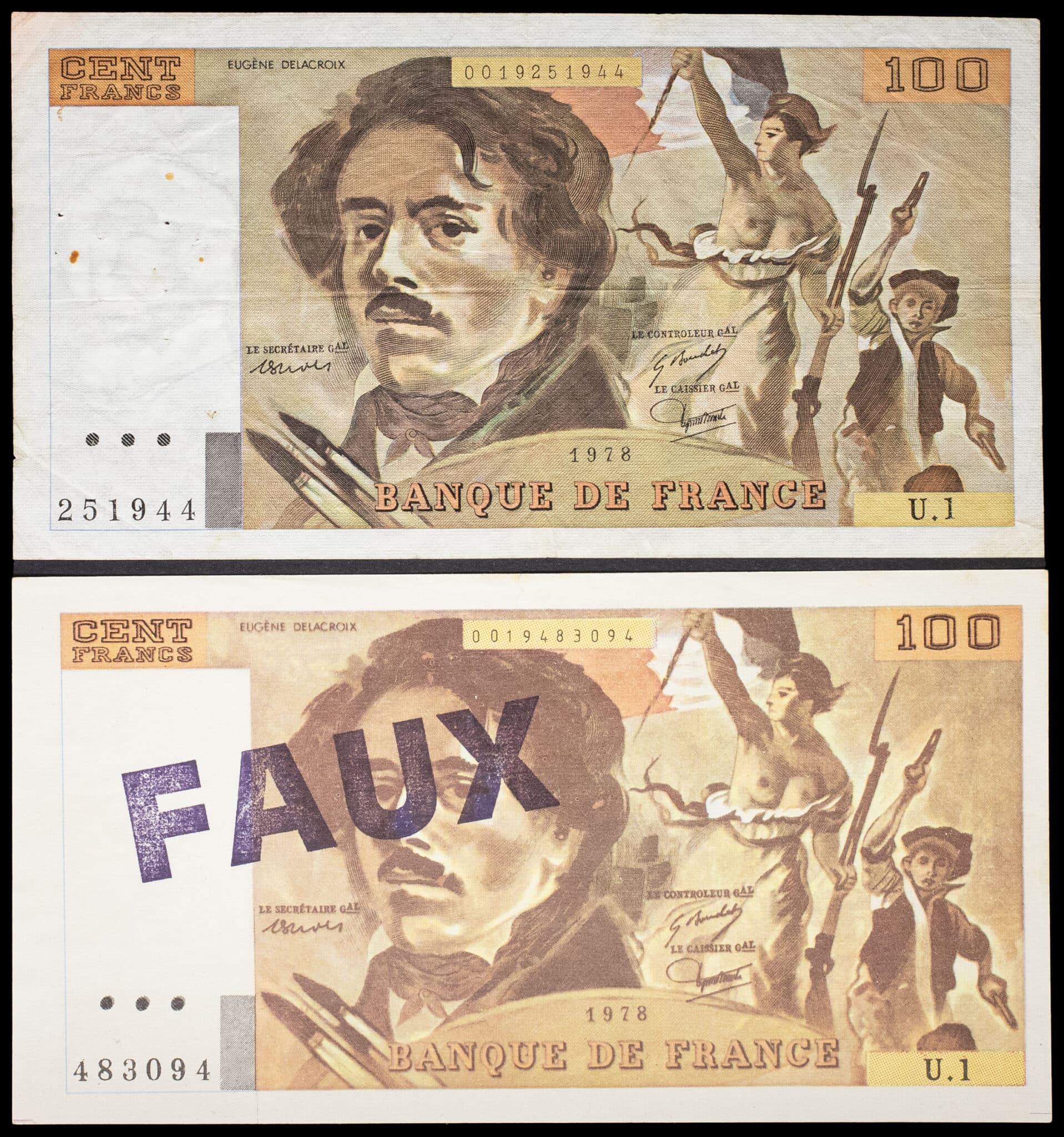 - Lot (2) - 100 francs type “Eugène Delacroix”, dont un faux d’époque (alphabet U.1) 1978.