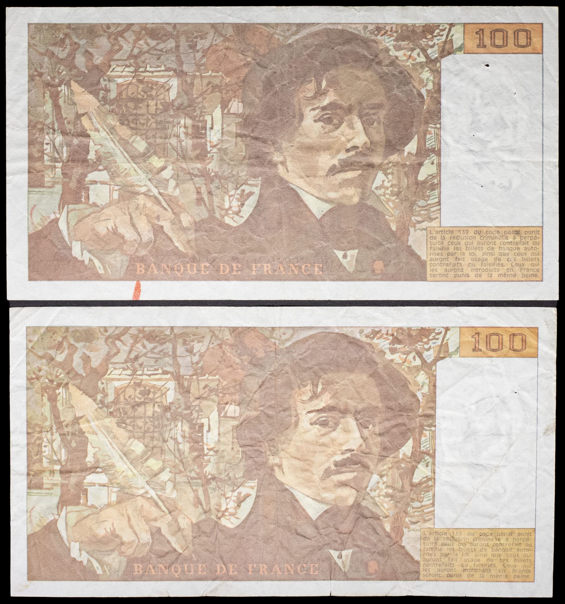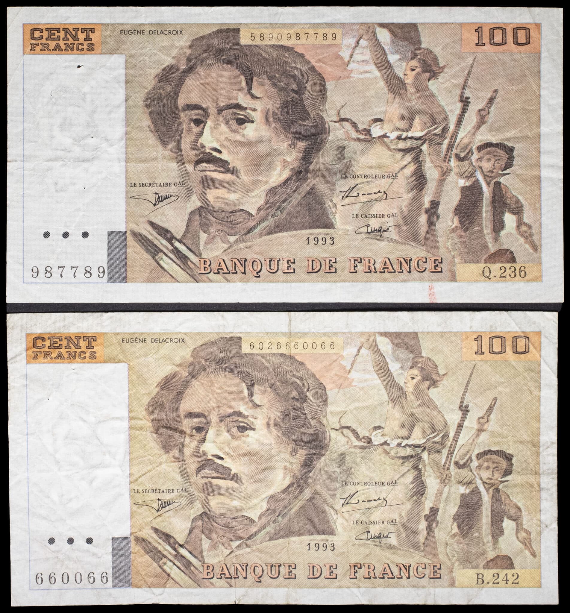 - Lot (2) - 100 francs type “Eugène Delacroix” impression en continu (alphabets 236 et 242) avec numéros radar 1993.