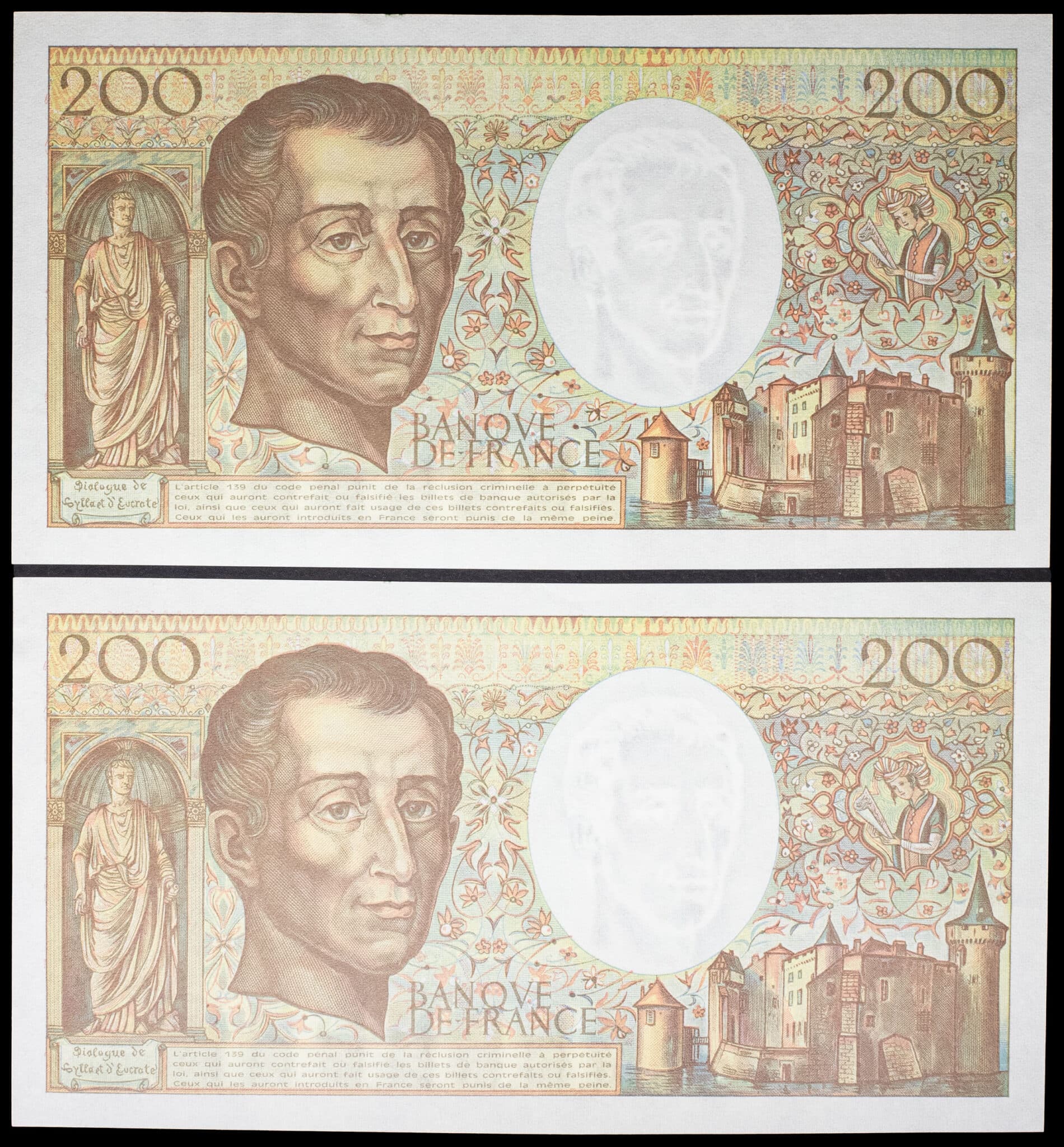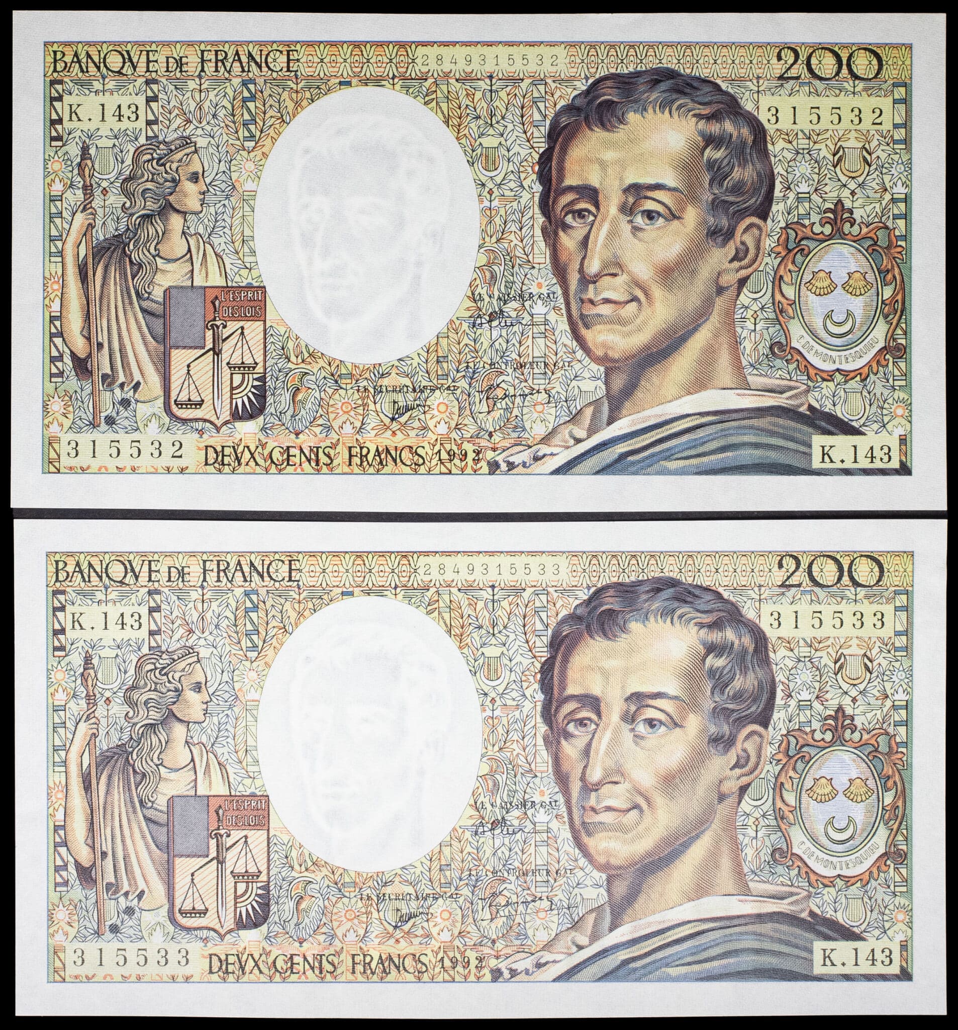 - Lot (2) - 200 francs type “Montesquieu” (alphabet 143) avec numéros consécutifs 1992.