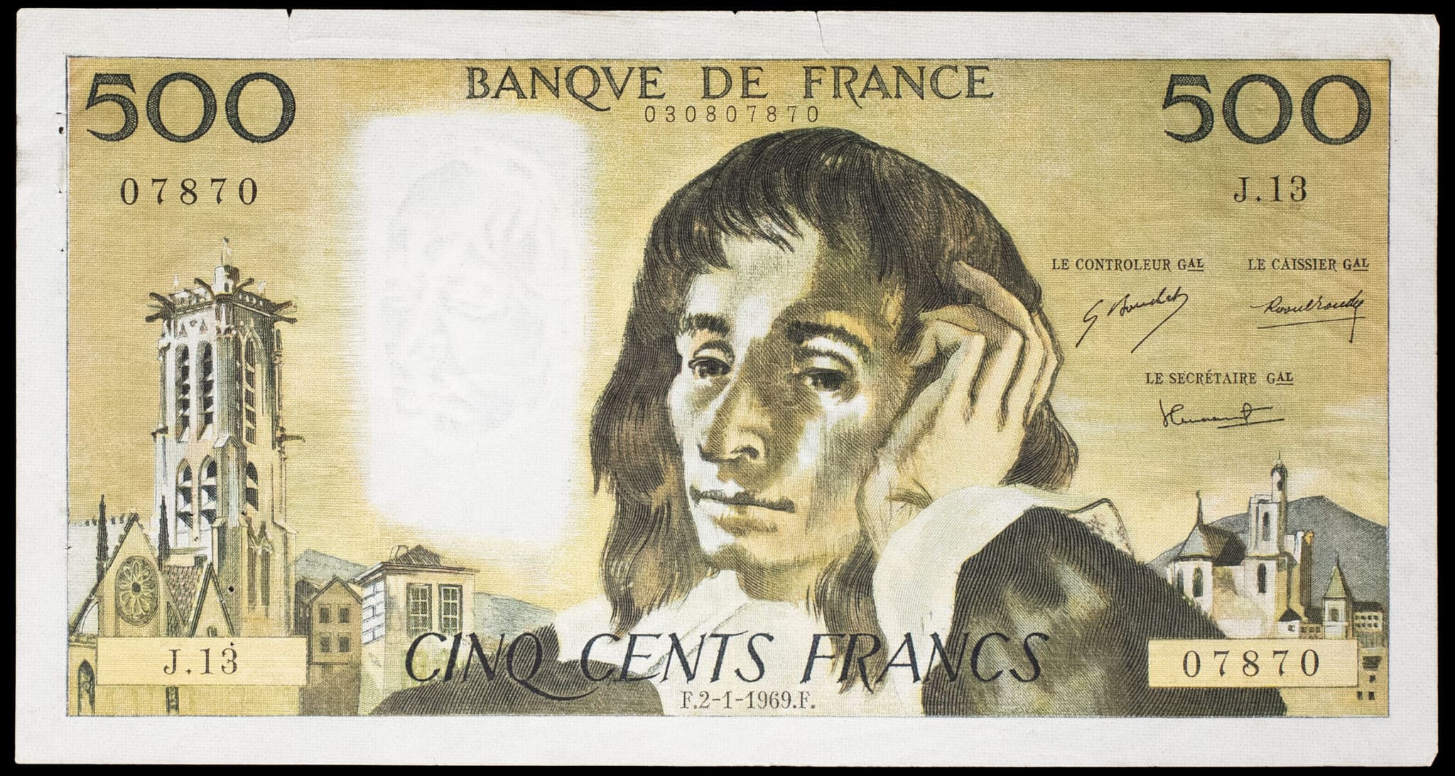 - 500 francs type “Blaise Pascal” (alphabet 13) avec numéro radar 2-1-1969.