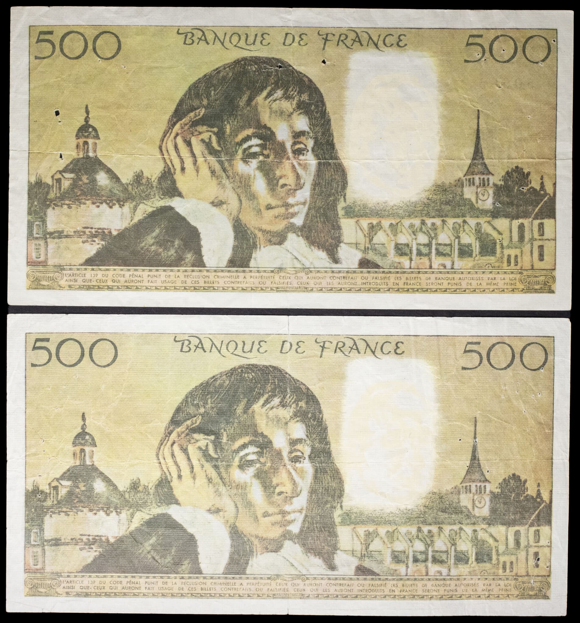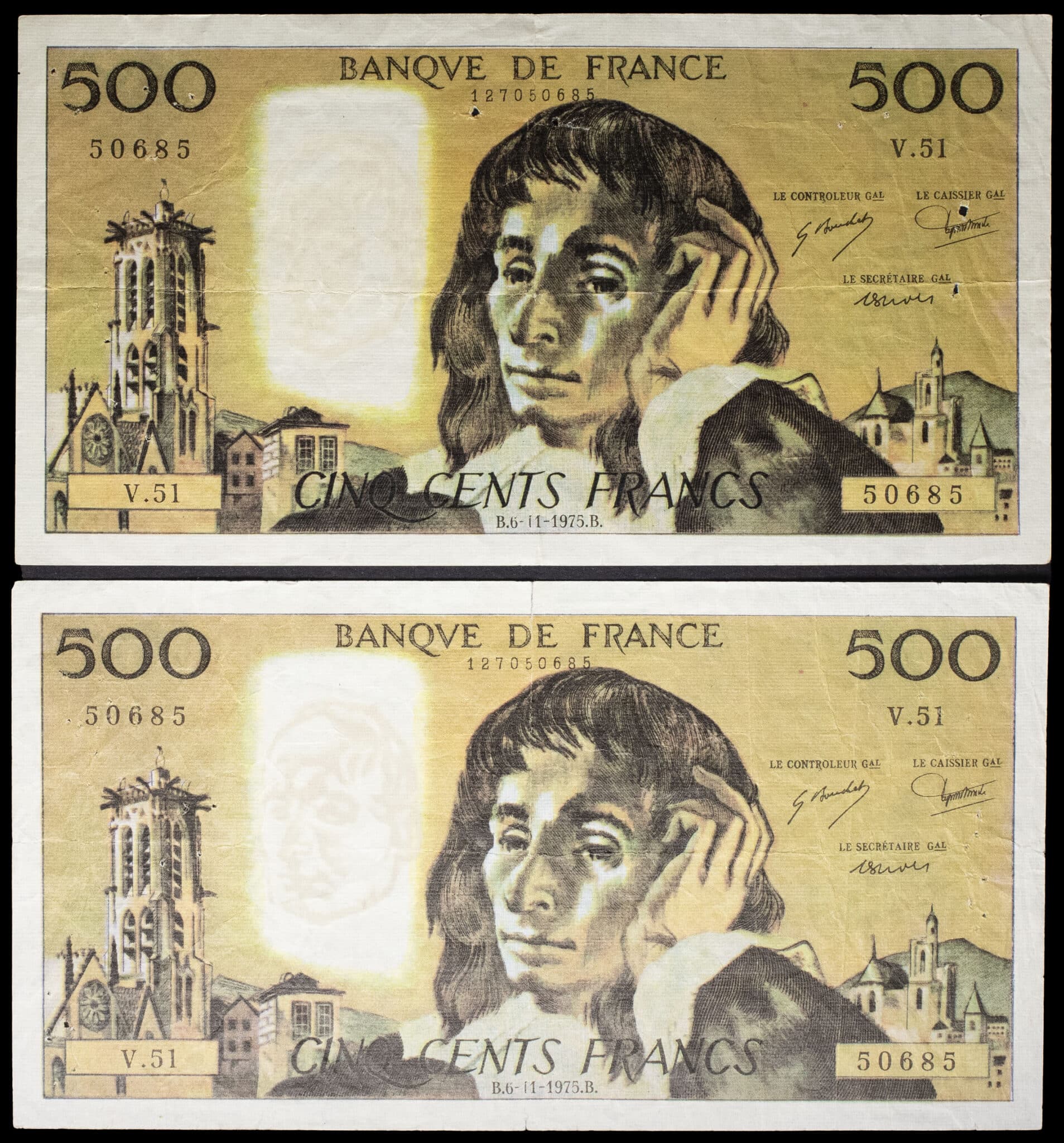 - Lot (2) - 500 francs type “Blaise Pascal”, faux d’époque identiques 6-11-1975.