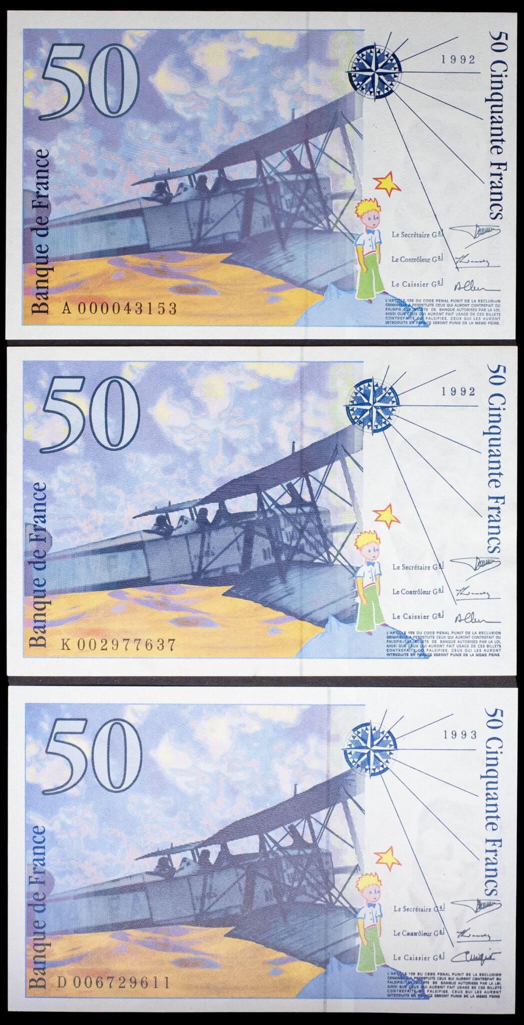 - Lot (3) - 50 francs type “Antoine de Saint-Exupéry” 1992-1993.