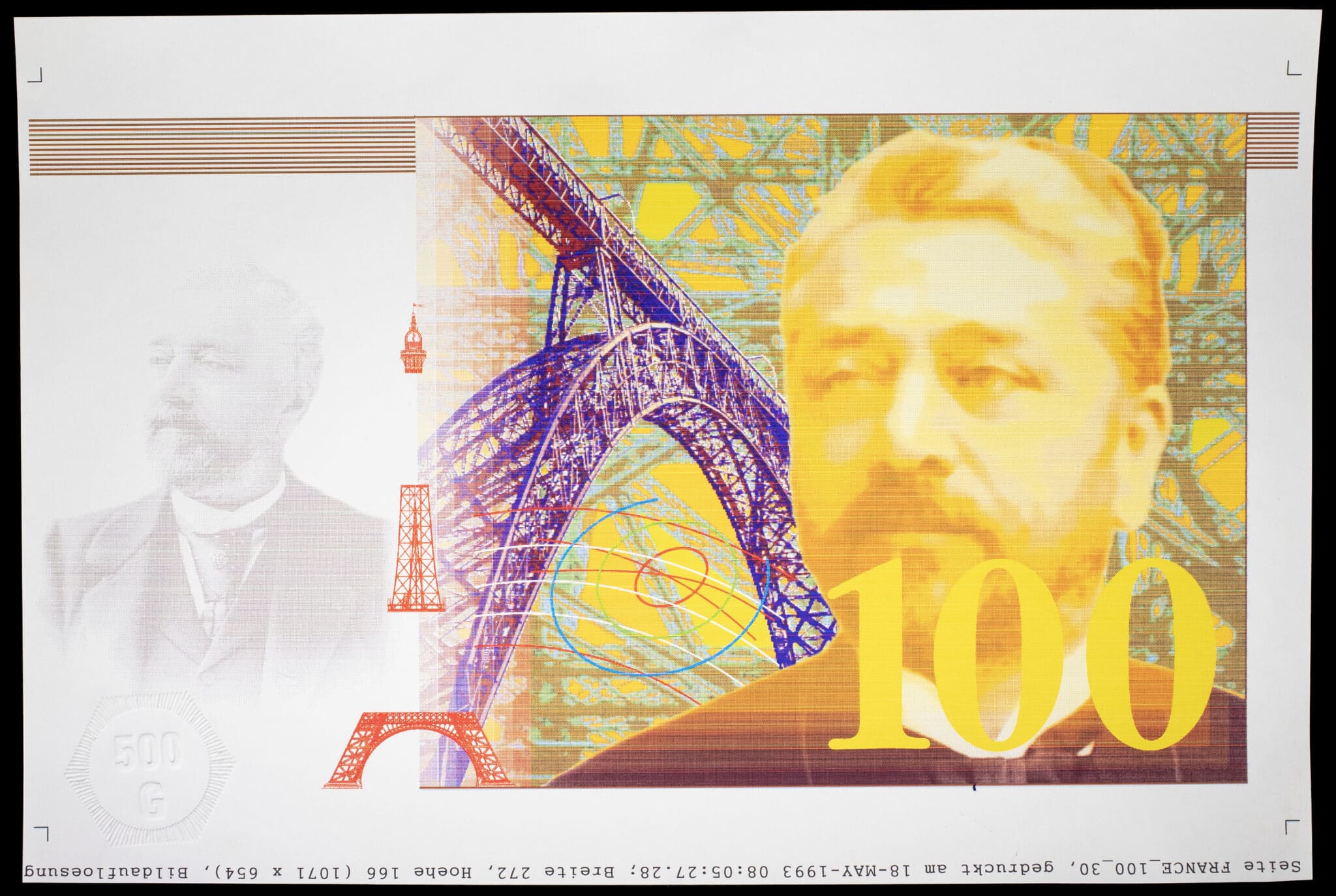 Épreuve agrandie de recto de 100 francs type “Gustave Eiffel” non adopté (FRONT PROOF) 18 mai 1993.