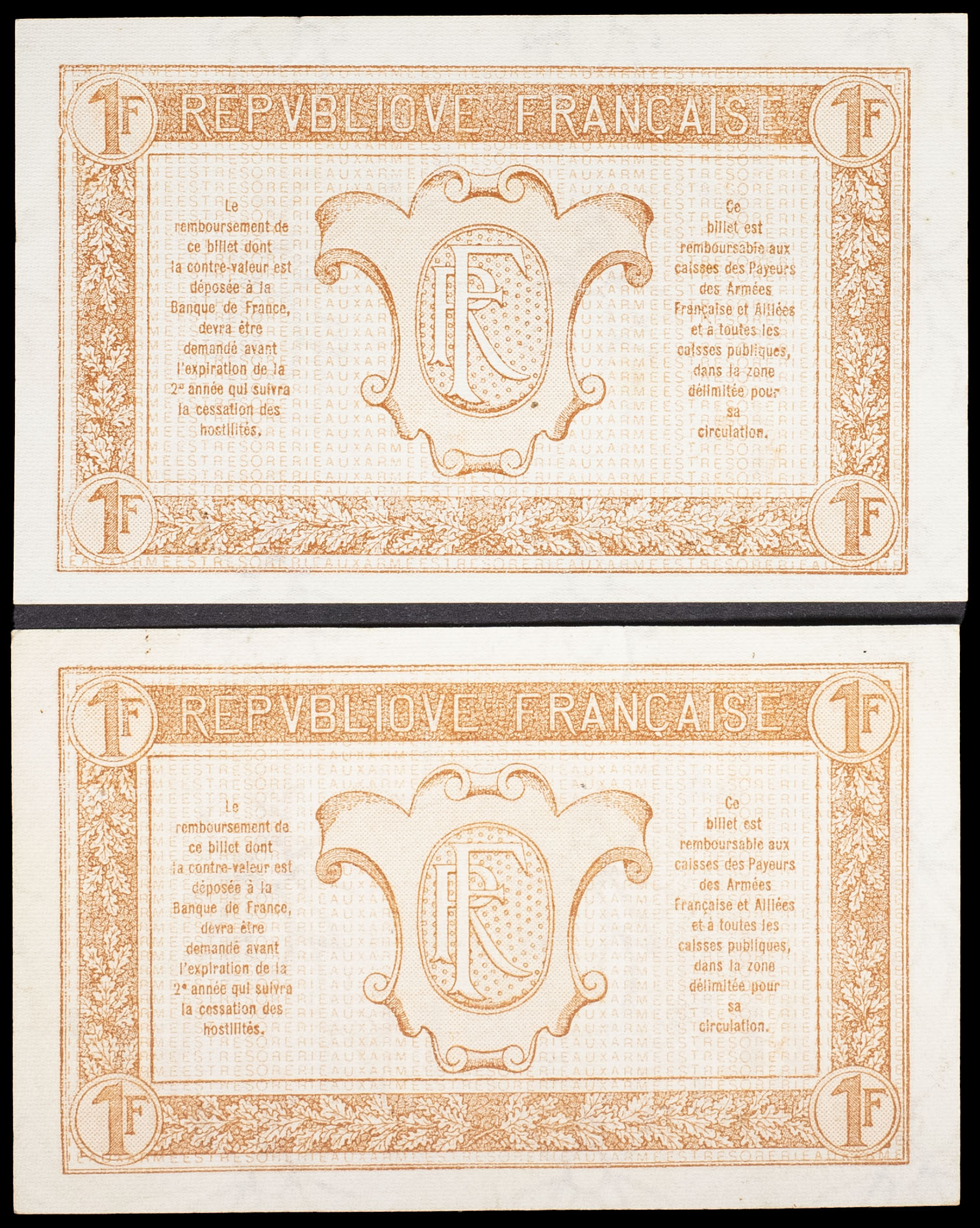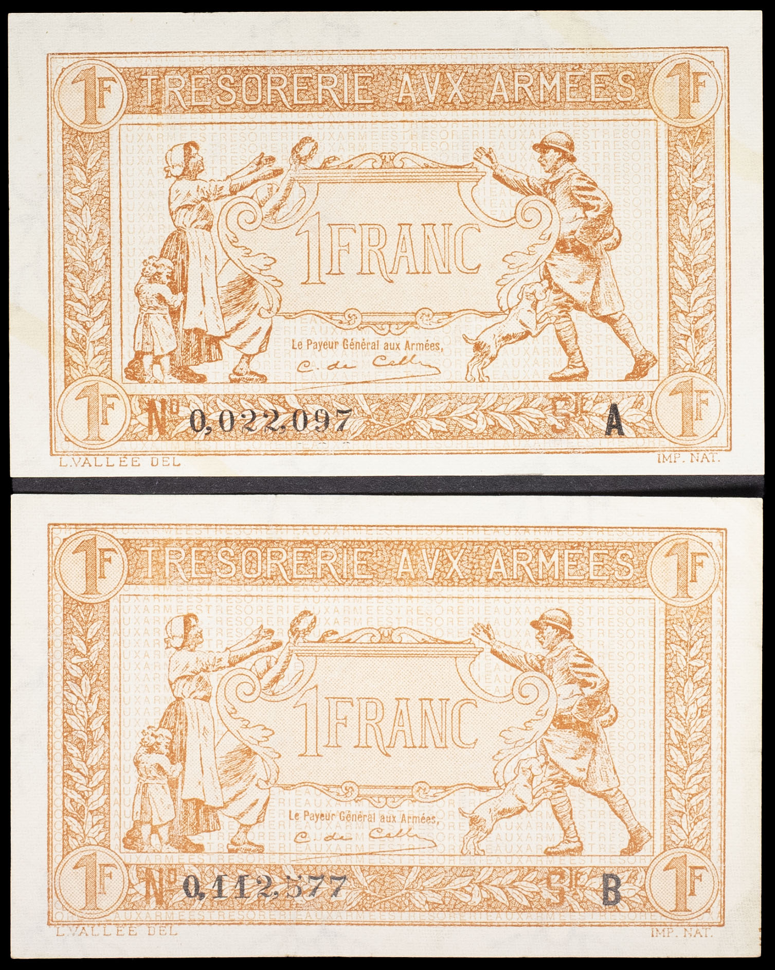 - Lot (2) - 1 franc type “Trésorerie aux armées”, 1ère émission 1917.