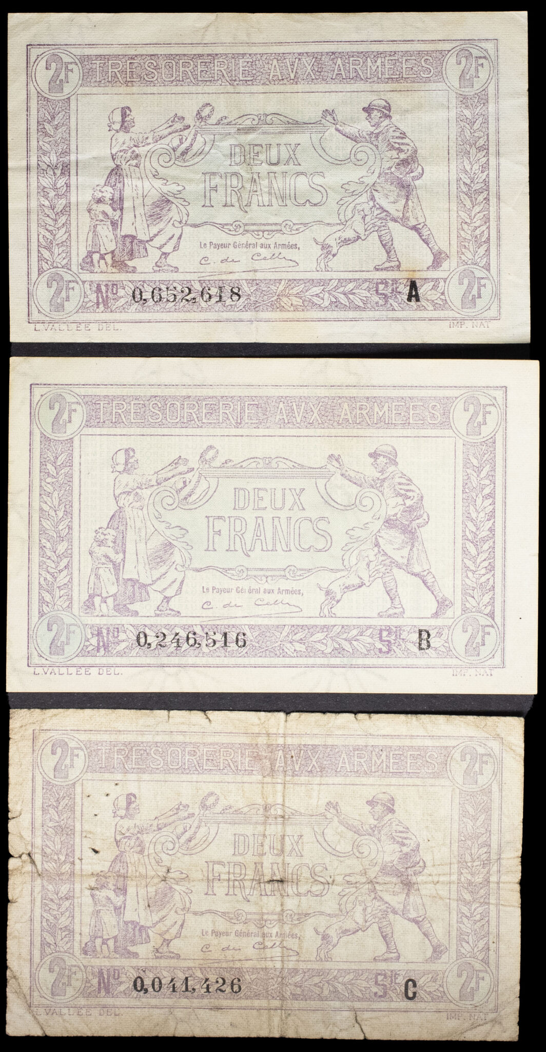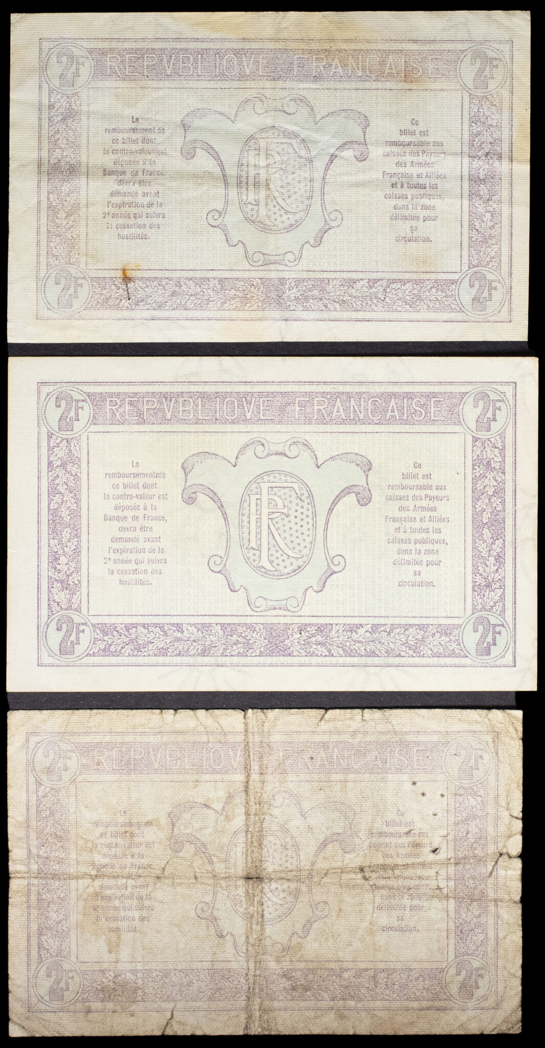 - Lot (3) - 2 francs type “Trésorerie aux armées” (série complète) 1917-1919.