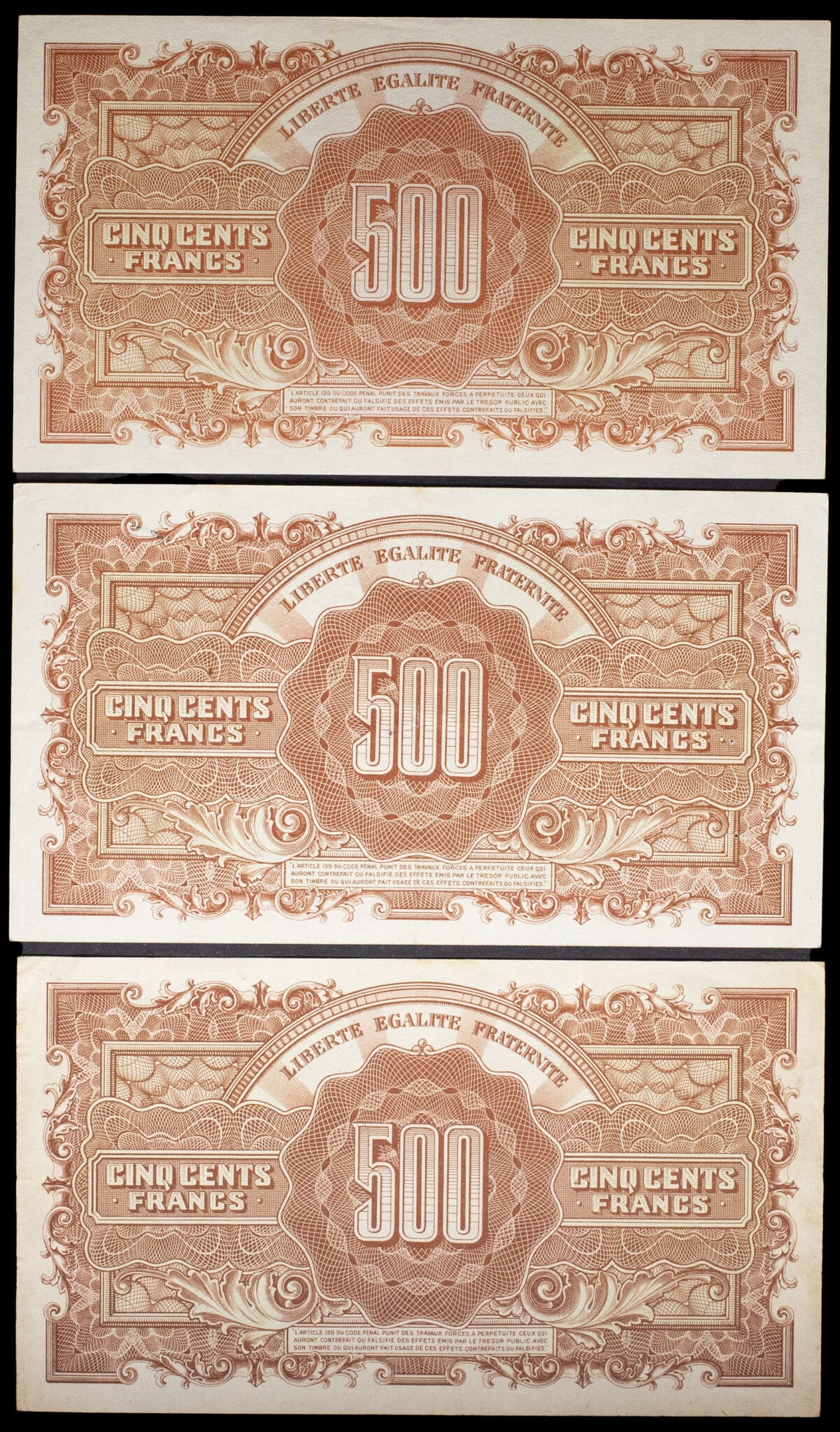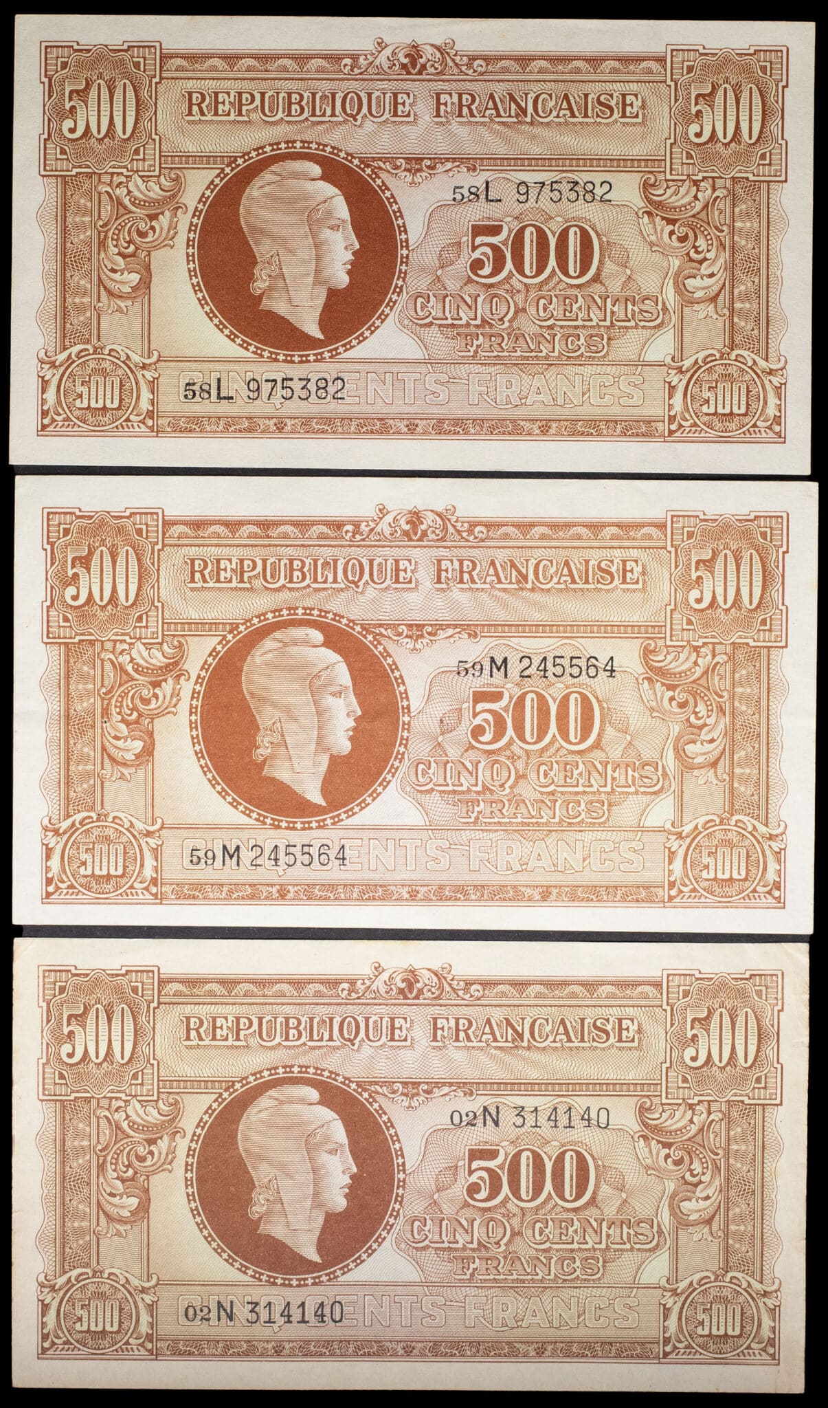 - Lot (3) - 500 francs type “Marianne” dit “Edmond Dulac”, impression anglaise ND (1945).