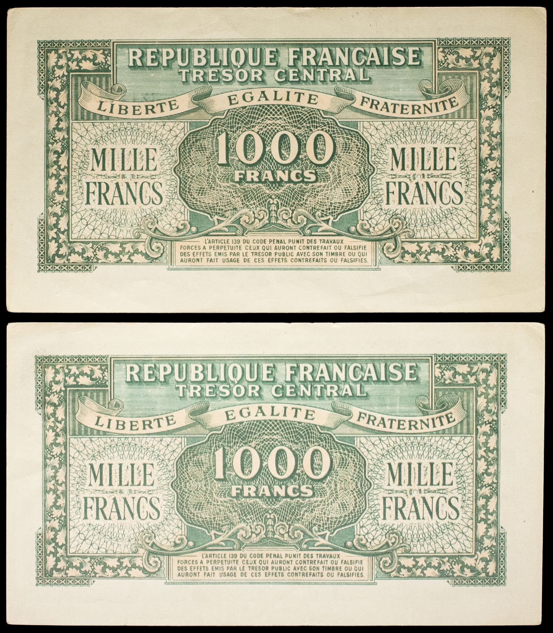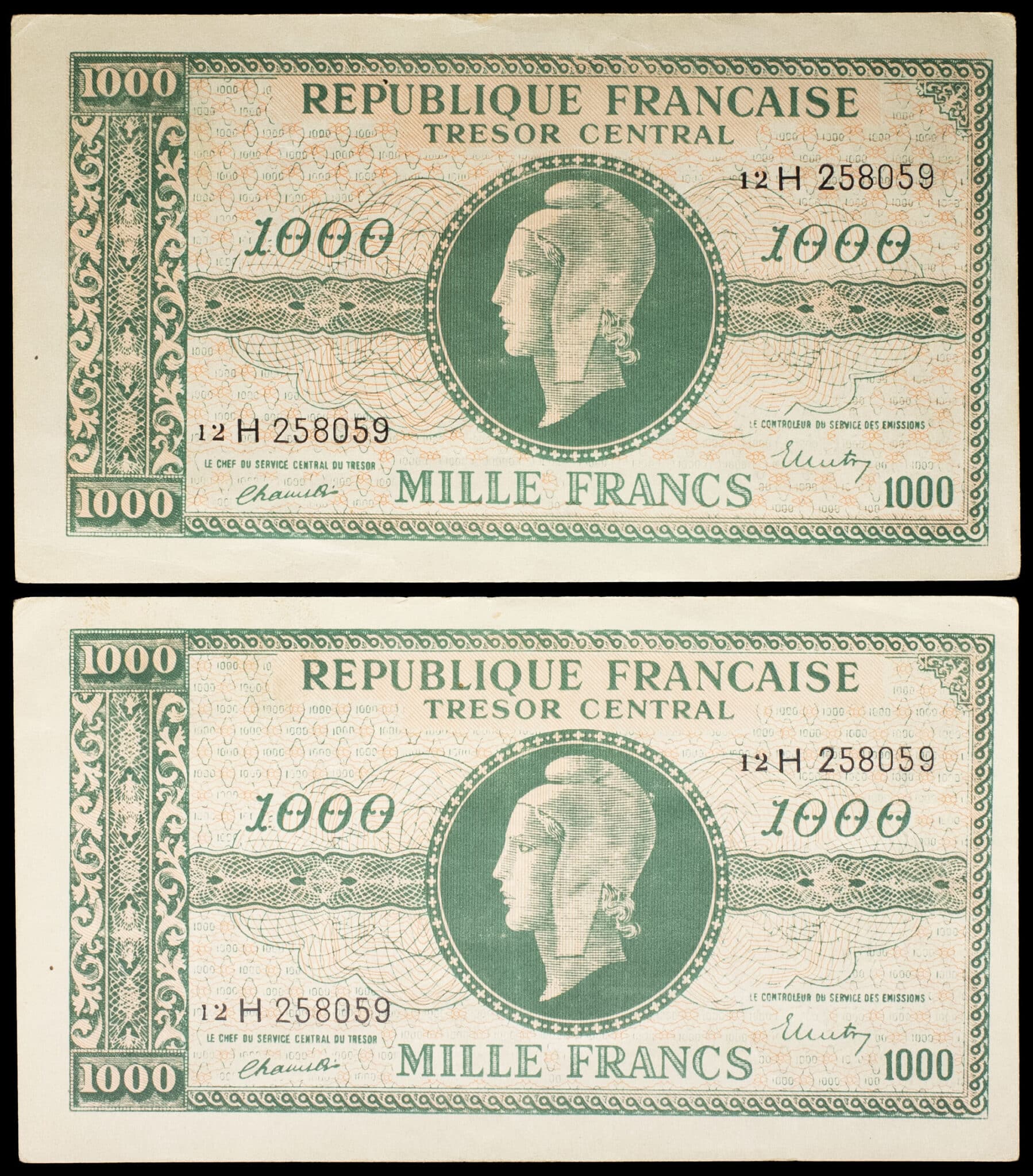 - Lot (2) - 500 francs type “Marianne” dit “Edmond Dulac” modifié, faux d’époque avec numéros identiques ND (1945).