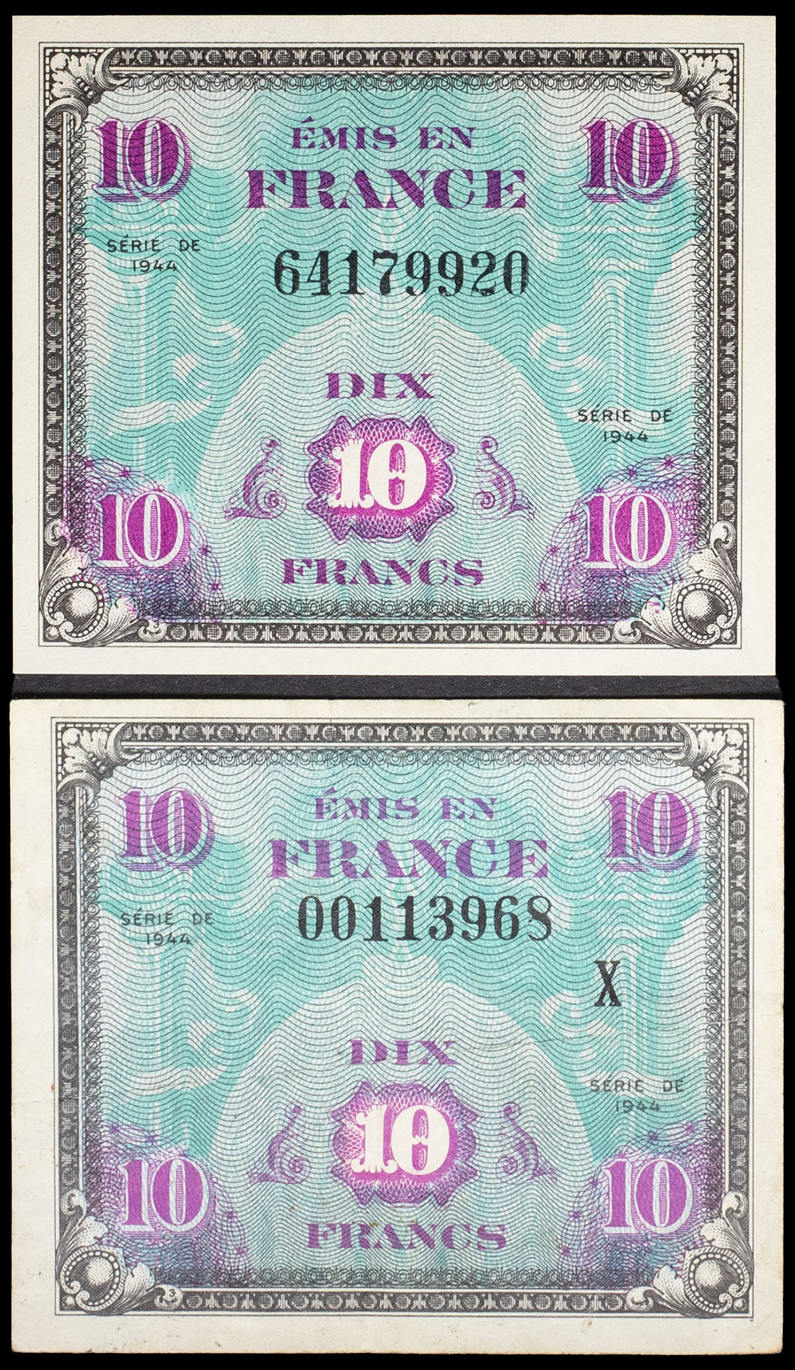 - Lot (2) - 10 francs type “Drapeau” (série complète) 1944.